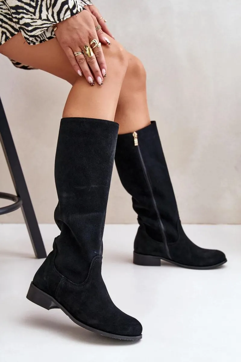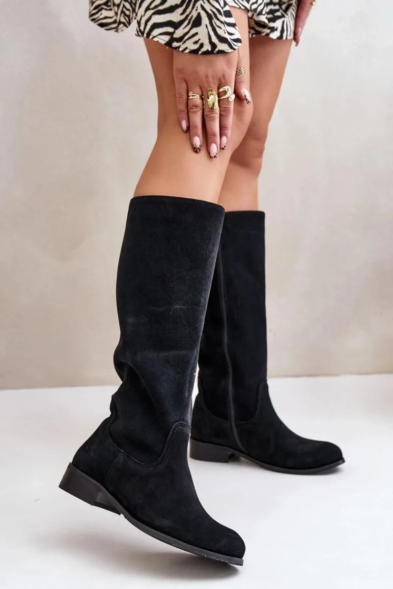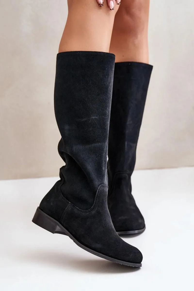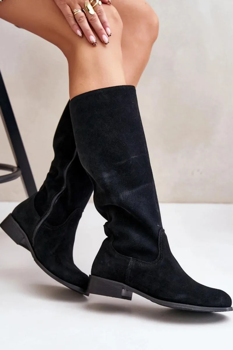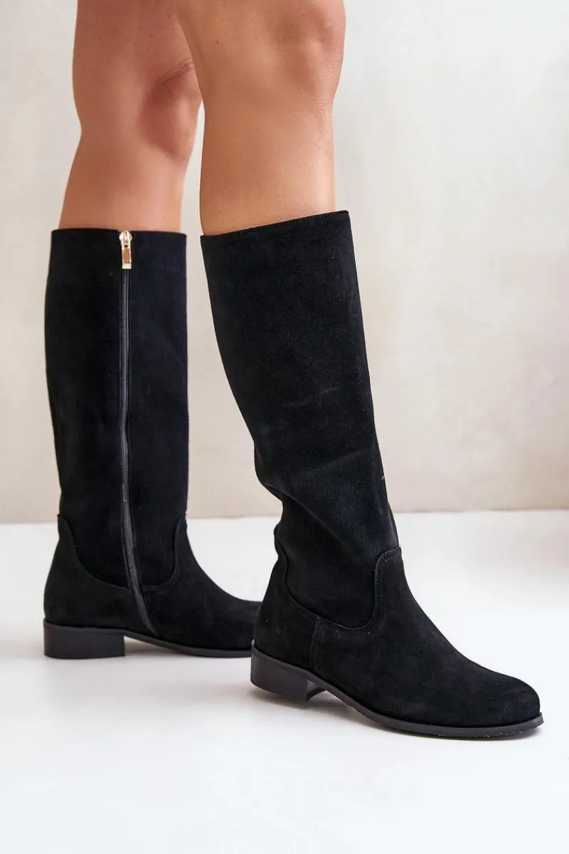 Kozaki damskie wykonane z wysokiej jakości naturalnego zamszu. Zapinane na suwak znajdujący się na boku. Osadzone na płaskim obcasie. Nie posiadają ocieplenia. Noski zaokrąglone. Zapiętek jest usztywniony. Wygodny i komfortowy w użytkowaniu model. Ten klasyczny fason świetnie sprawdzi się w wielu stylizacjach! Przy wyborze rozmiaru prosimy sugerować się tabelą rozmiarów.