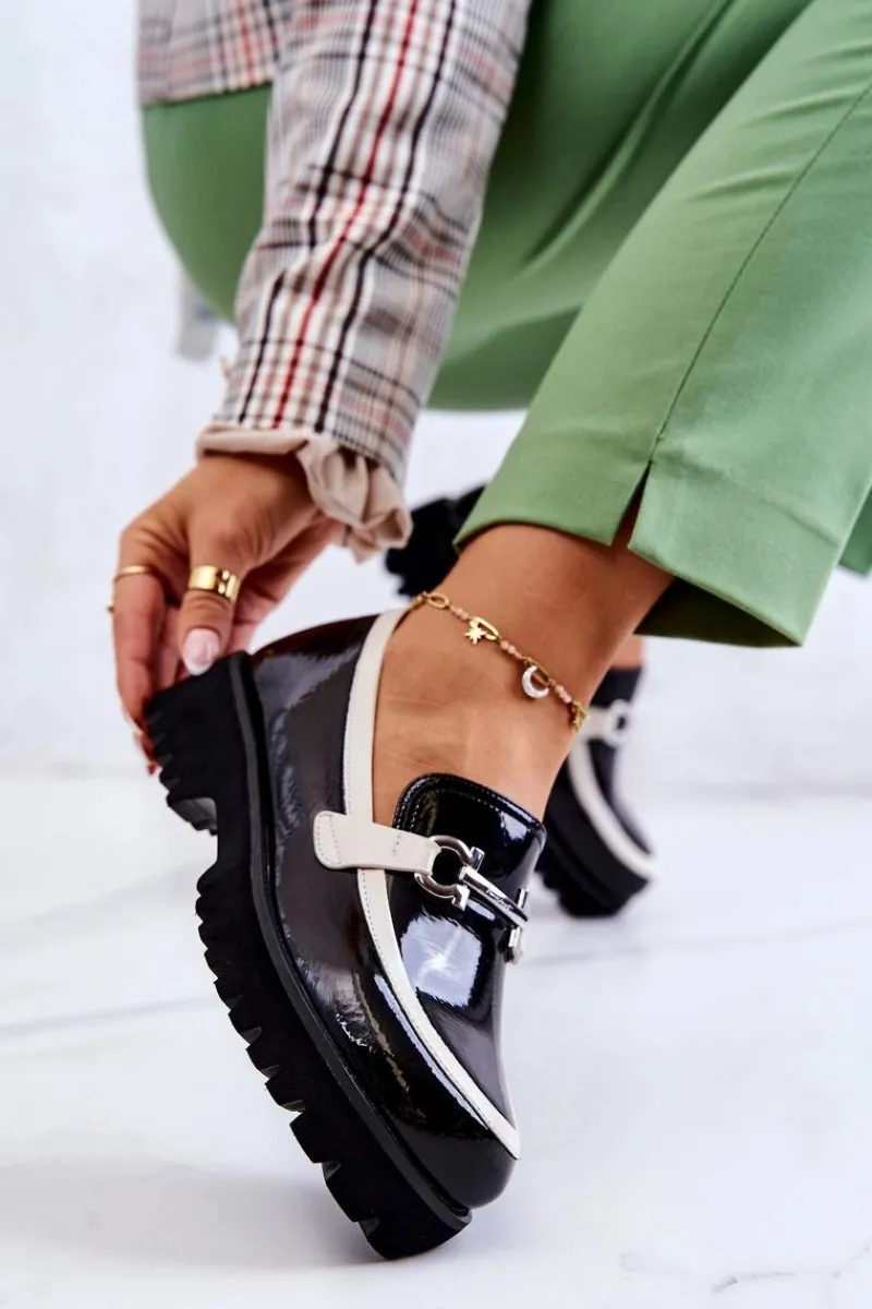 Marzysz o nowych półbutach? Ten model jest stworzony z myślą o nadchodzących modowych trendach! Wykonane z lakierowanej eko skóry półbuty w stylu loaferów. Posiadają zaokrąglony nosek oraz metalową ozdobę. Wkładka wykonana z naturalnej skóry jest bardzo wygodna w użytkowaniu. Masywna podeszwa wraz z płaskim obcasem jest wykonana z tworzywa sztucznego. Ten wspaniały model czeka właśnie na Ciebie! Przy wyborze rozmiaru prosimy sugerować się tabelą rozmiarów.