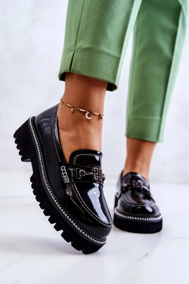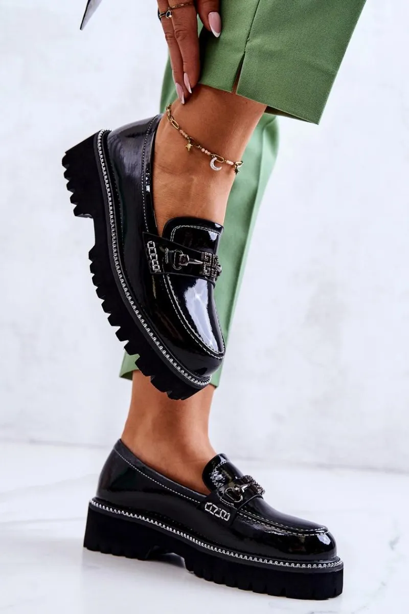 Wykonane z lakierowanej eko skóry półbuty w stylu loaferów! Cholewka do kostki. Buty posiadają pasek na przodzie z ozdobnym elementem. Nosek zaokrąglony. Podeszwa wykonana z tworzywa sztucznego z dużym bieżnikiem. Płaski obcas zapewni stabilność na każdym kroku. Wkładka została wykonana z naturalnej skóry i jest bardzo wygodna w użytkowaniu. Koniecznie sprawdź pozostałe modele półbutów dostępne w naszej ofercie! Przy wyborze rozmiaru prosimy sugerować się tabelą rozmiarów.
