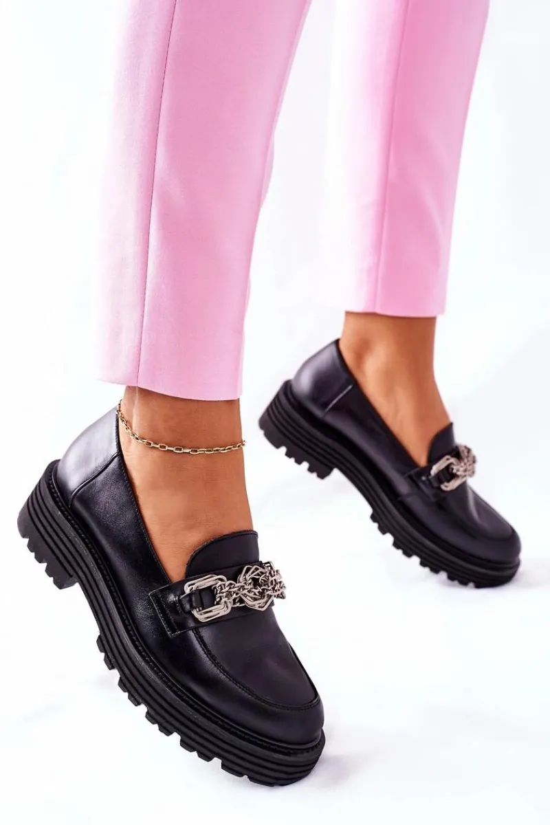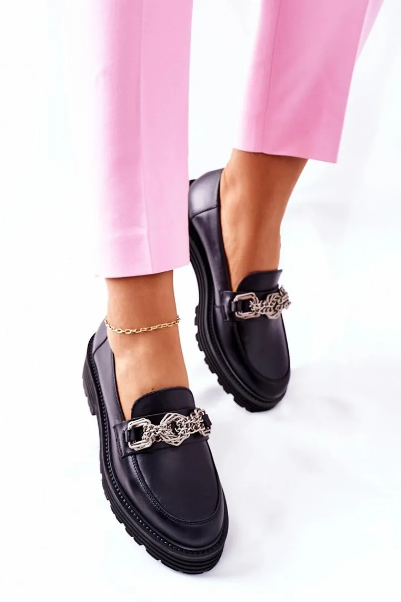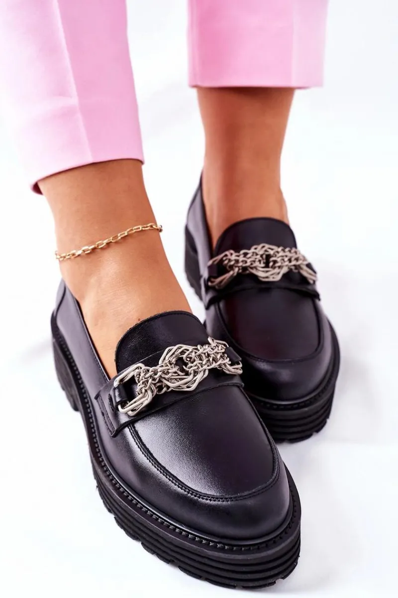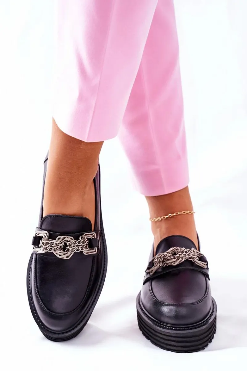 Klasyczne półbuty w stylu przepięknych loaferów! Buty zostały wykonane z wysokiej jakości skóry naturalnej. Charakterystyczne zdobienie w postaci łańcucha sprawi, że stworzymy z nimi wiele wspaniałych stylizacji. Wysoka podeszwa oraz obcas, który uniesie naszą sylwetkę. Przy wyborze rozmiaru prosimy sugerować się tabelą rozmiarów.