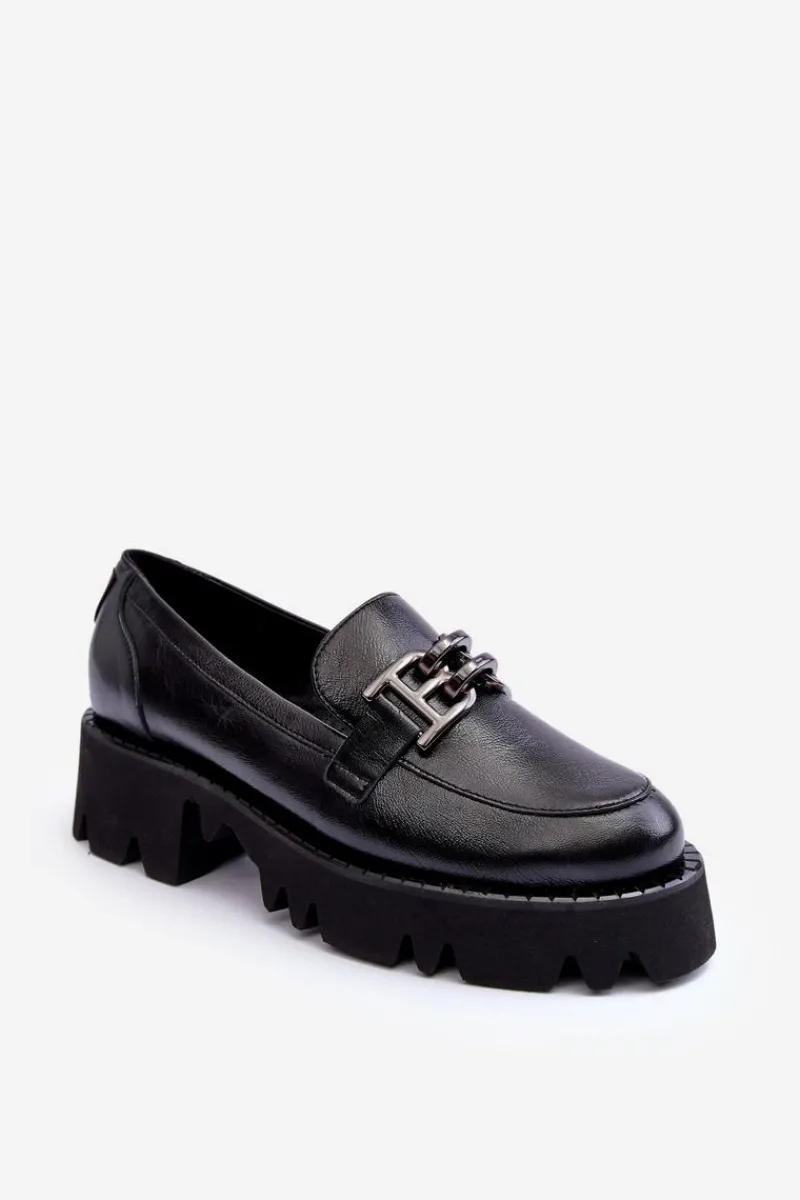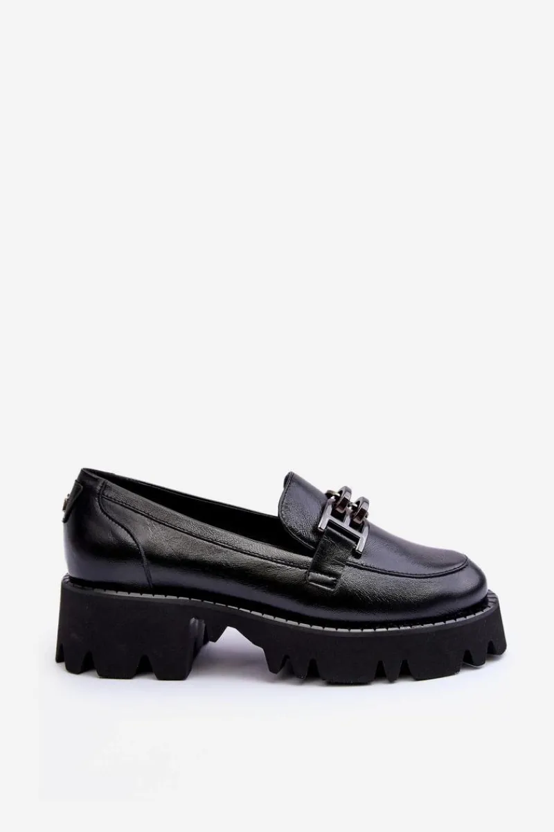 Eleganckie półbuty damskie osadzone na masywnej platformie i płaskim, stabilnym obcasie. Wykonane ze skóry naturalnej. Model klasyczny, wsuwany. Zapiętek usztywniony, noski zaokrąglone. Z przodu znajduje się ozdoba z tworzywa sztucznego. Miękka skórzana wkładka zapewni komfortowe użytkowanie obuwia. Buty te sprawdzą się w wielu stylizacjach! Koniecznie sprawdź całą naszą kolekcję półbutów! Przy wyborze rozmiaru prosimy sugerować się tabelą rozmiarów.