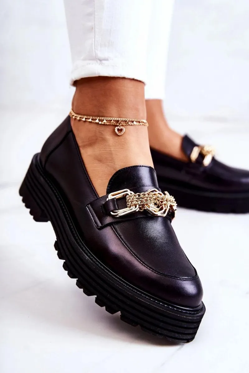 Klasyczne półbuty w stylu przepięknych loaferów! Buty zostały wykonane z wysokiej jakości skóry naturalnej. Charakterystyczne zdobienie w postaci łańcucha sprawi, że stworzymy z nimi wiele wspaniałych stylizacji. Posiadają wysoką podeszwę obszytą nicią oraz płaski obcas, który uniesie sylwetkę. Świetny model do wielu stylizacji! Wygodne, a zarazem modne. Koniecznie musisz je mieć! Przy wyborze rozmiaru prosimy sugerować się tabelą rozmiarów.