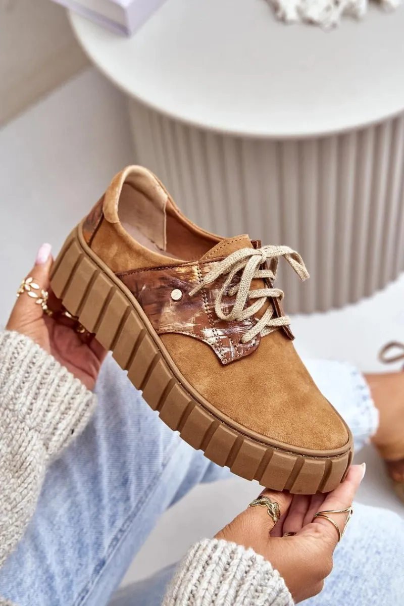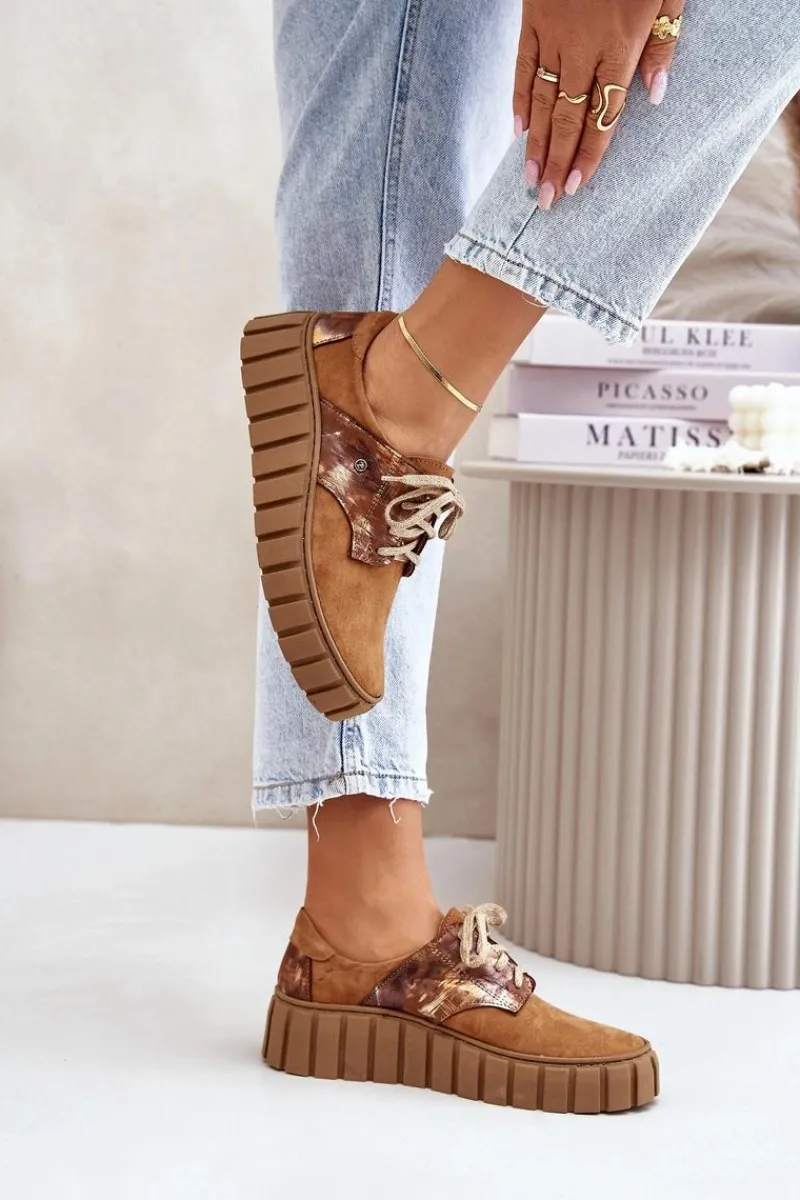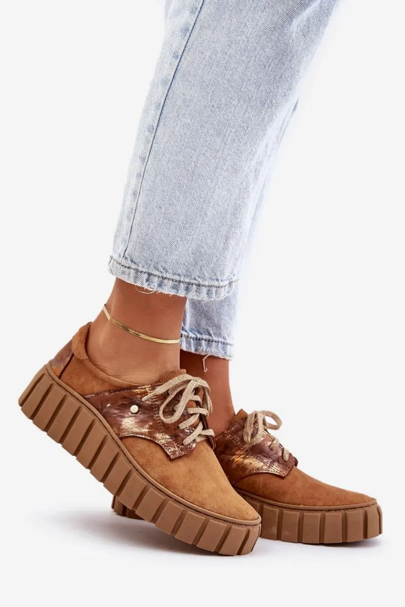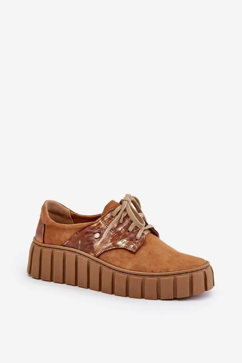 Półbuty posiadają wiązanie na płaskie, ozdobione błyszczącą nicią sznurowadła. Osadzone na masywnej platformie ze żłobieniami po bokach. Wewnątrz wygodna wkładka z naturalnej skóry, która jest dodatkowo profilowana. Cholewka przed kostkę została wykonana z naturalnego zamszu z efektem metalicznym. Bardzo lekkie i komfortowe w użytkowaniu. Idealne do eleganckich spodni, tiulowych spódnic czy dzianinowych sukienek. Możesz je łączyć z różnymi stylizacjami – zawsze będą wyglądać świetnie! Te cudne buty zdecydowanie muszą znaleźć się w Twojej garderobie! Przy wyborze rozmiaru prosimy sugerować się tabelą rozmiarów.