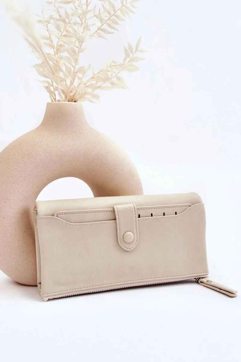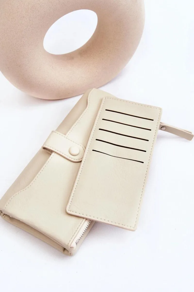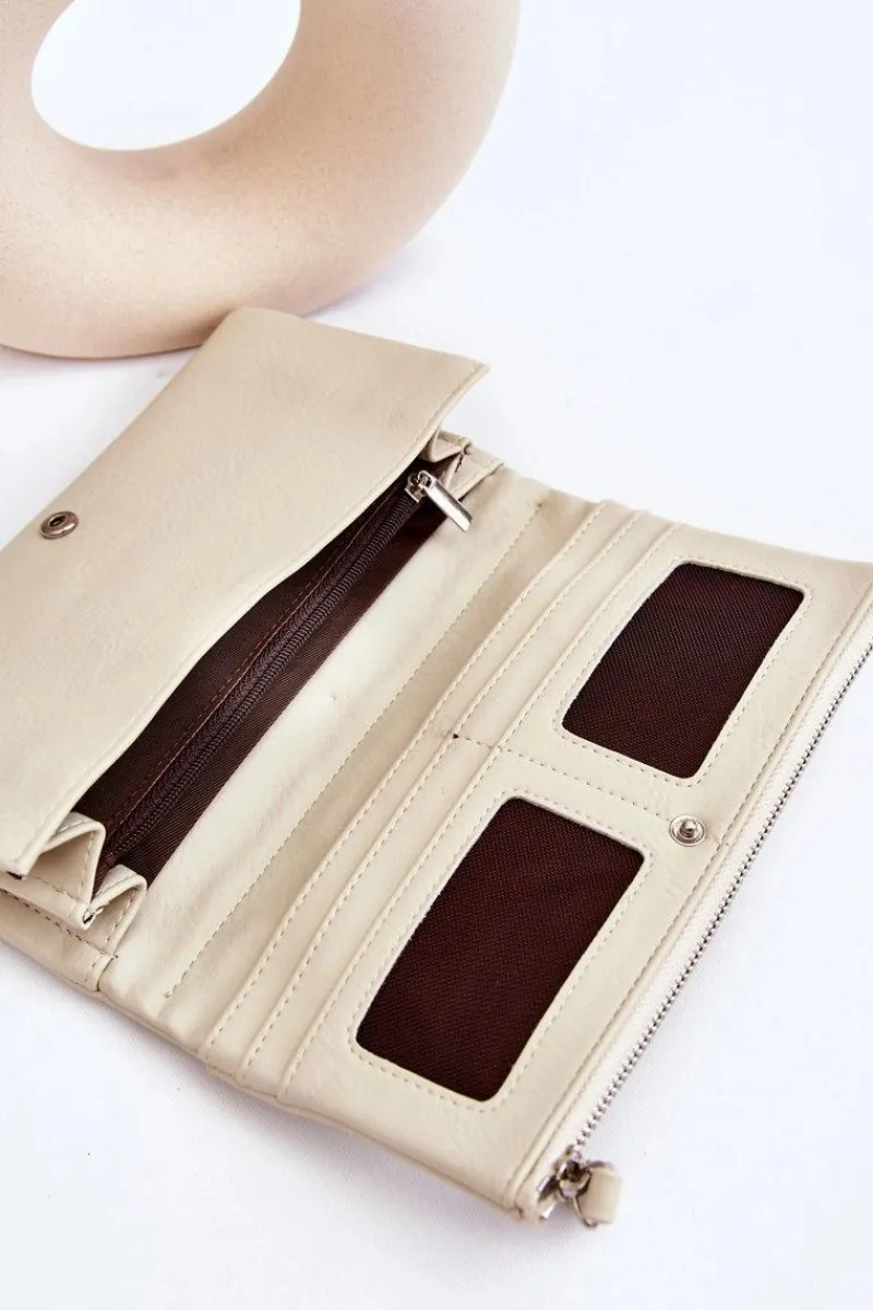 Duży, damski portfel zapinany na napy oraz zamek błyskawiczny. Został wykonany z eko skóry. W środku znajdują się otwarte komory oraz jedna zamykana na suwak. Dodatkowo także portfel zawiera wiele miejsc na wizytówki czy karty kredytowe. Na zewnątrz także znajduje się dodatkowa kieszonka zamykana na zamek błyskawiczny oraz kolejna komora zapinana na napę. Ten portfel pomieści najpotrzebniejsze rzeczy, takie jak: dokumenty czy pieniądze.