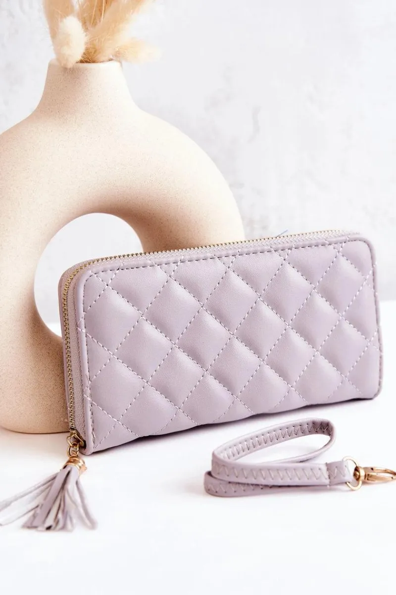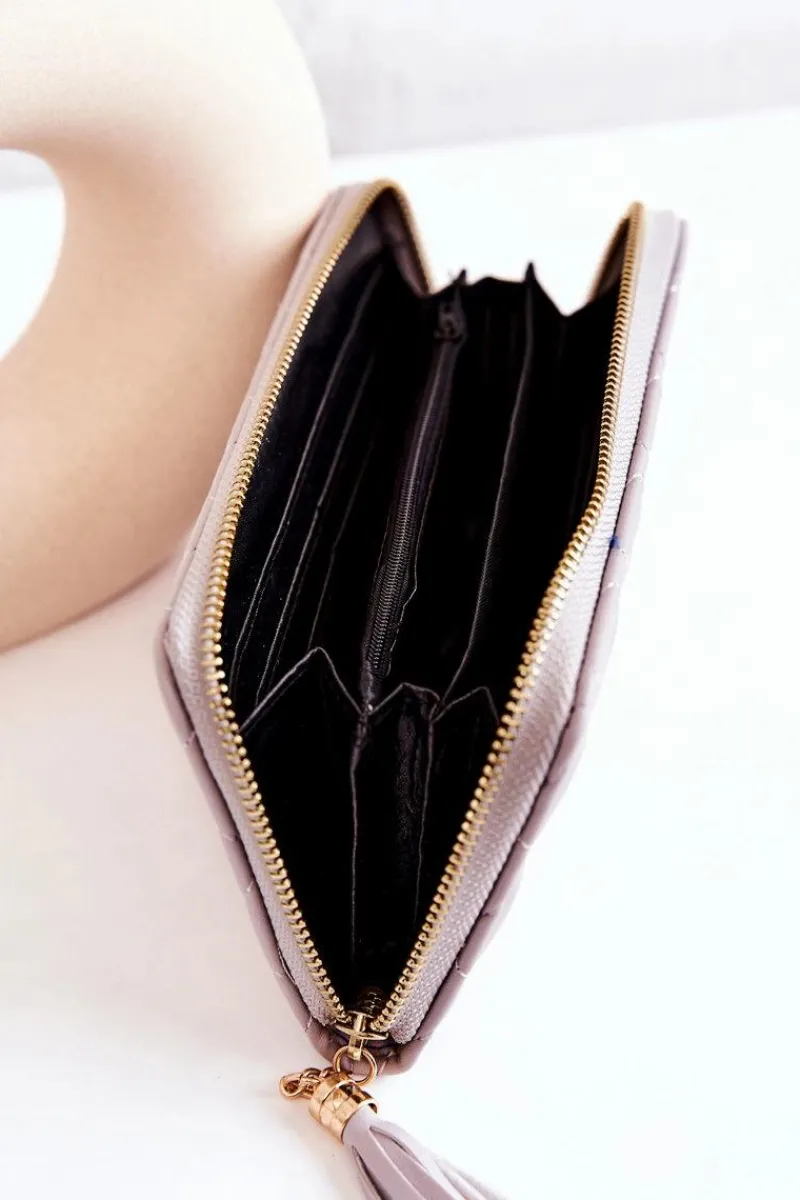 Świetny, duży portfel zapinany na zamek błyskawiczny z frędzelkiem. Posiada dodatkowy paseczek. Portfel pomieści bilon, banknoty oraz posiada otwarte kieszonki na karty i dokumenty. Wykonany został ze skóry ekologicznej, pikowanej. W środku posiada trzy komory z dwoma przegródkami. Znajduje się tam także kieszonka zapinana na suwak. Spraw prezent sobie lub komuś bliskiemu!