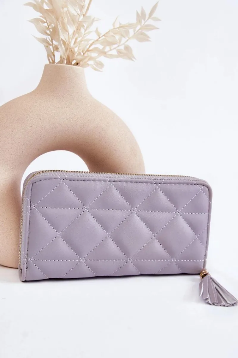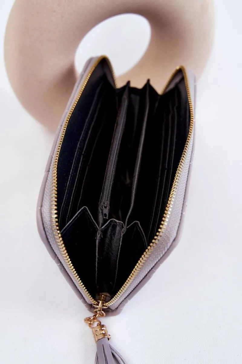 Duży i praktyczny portfel zapinany na zamek błyskawiczny z frędzelkiem. Portfel pomieści bilon, banknoty oraz posiada otwarte kieszonki na karty i dokumenty. Wykonany został ze skóry ekologicznej. W środku posiada trzy komory z dwoma przegródkami. Znajduje się tam także kieszonka zapinana na suwak. Spraw prezent sobie lub komuś bliskiemu!