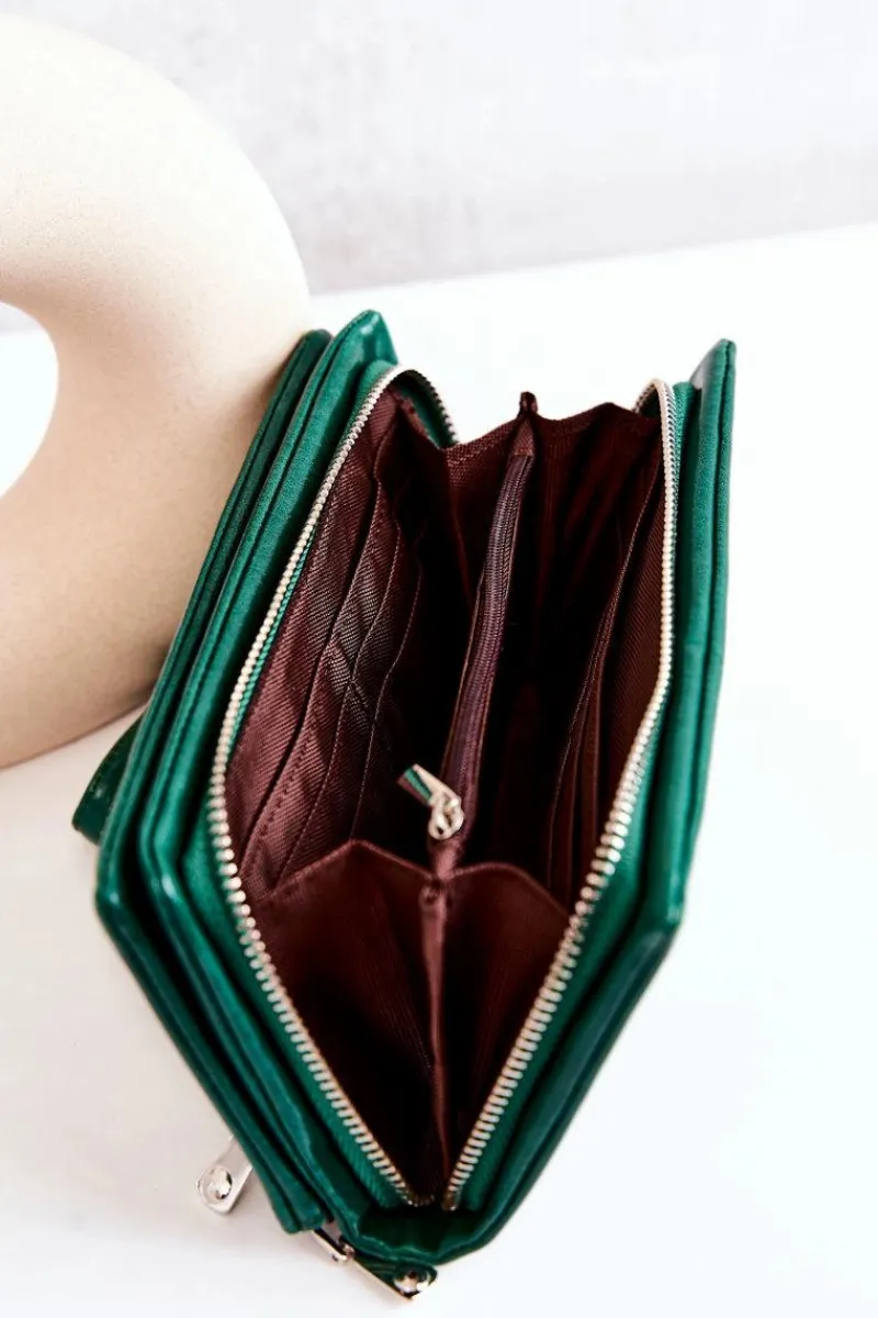 Portfel został wykonany z eko skóry. Posiada na zewnątrz trzy kieszonki zamykane na suwak – małą, średnią i dużą. Dodatkowo przy suwaku dużej kieszonki znajduje się paseczek w kolorze, a w środku miejsce na wizytówki, bilony oraz banknoty. Pięknie prezentuje się jako dodatek. Koniecznie musisz go mieć!