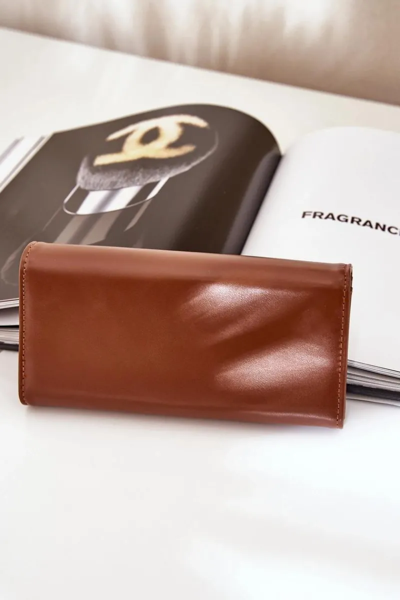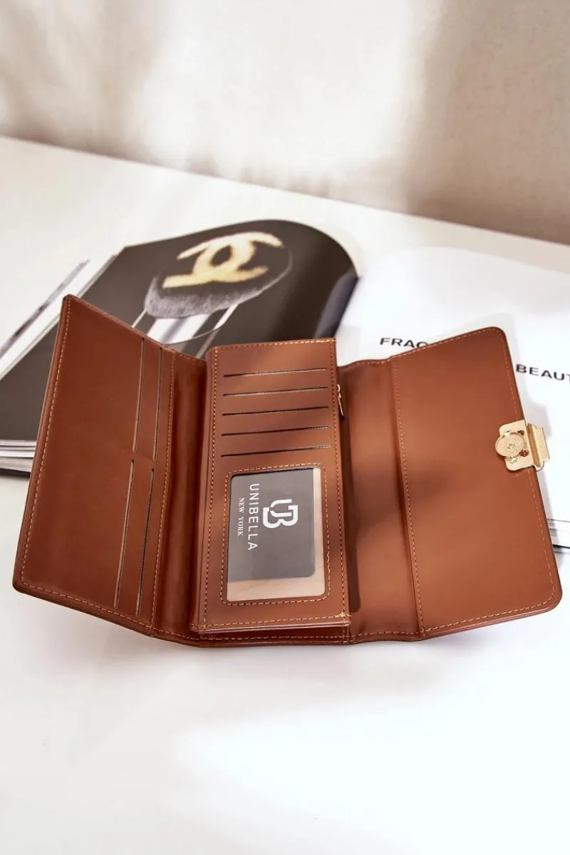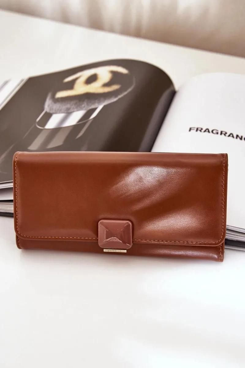Stylowy damski portfel wykonany z eko skóry, zapinany na magnes. Wnętrze wyposażone w kieszeń na monety, przegródki na karty, miejsce na banknoty oraz fotografię. Elegancki i funkcjonalny, doskonały zarówno na co dzień, jak i jako prezent dla bliskiej osoby!