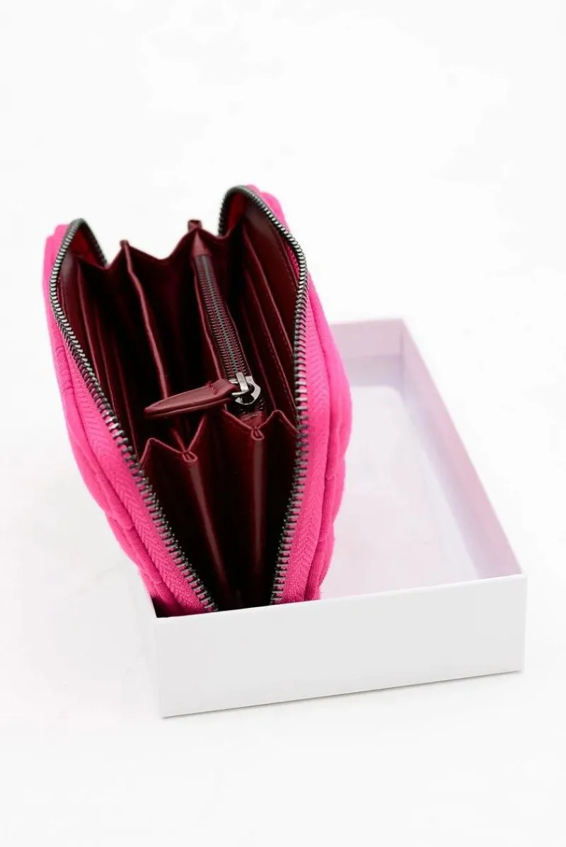Dopełnieniem każdej kobiecej stylizacji jest nie tylko torebka i buty ale również dobrze dobrany portfel. Portfel wykonany z najwyższej jakości delikatnego materiału tekstylnego. Portfel zapinany jest na srebrny suwak. Wewnątrz znajdują się 3 duże kieszonki na banknoty/inne dokumenty oraz 1 duża zapinana na suwak komora na bilon, 5 małych kieszonek na karty.