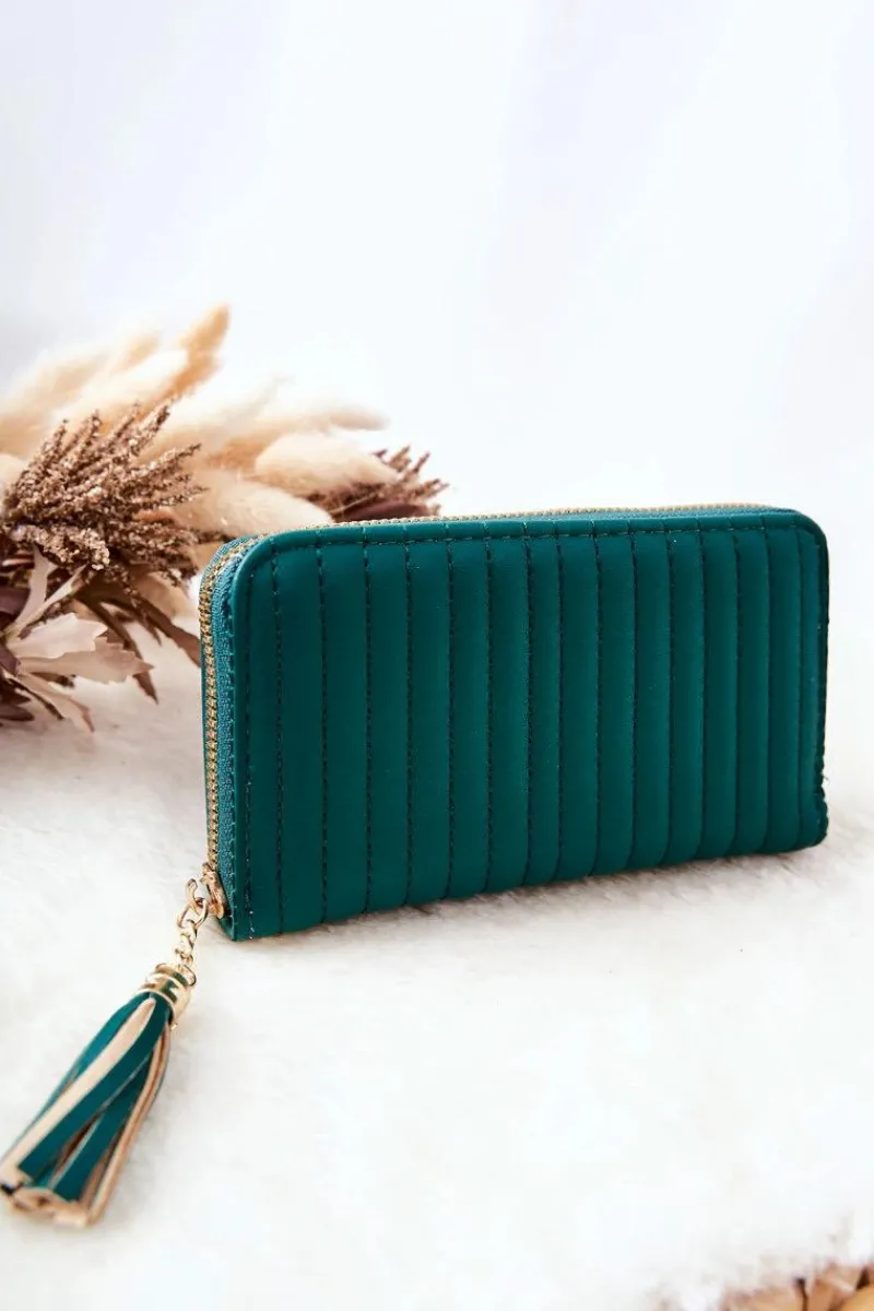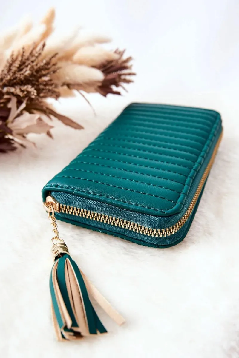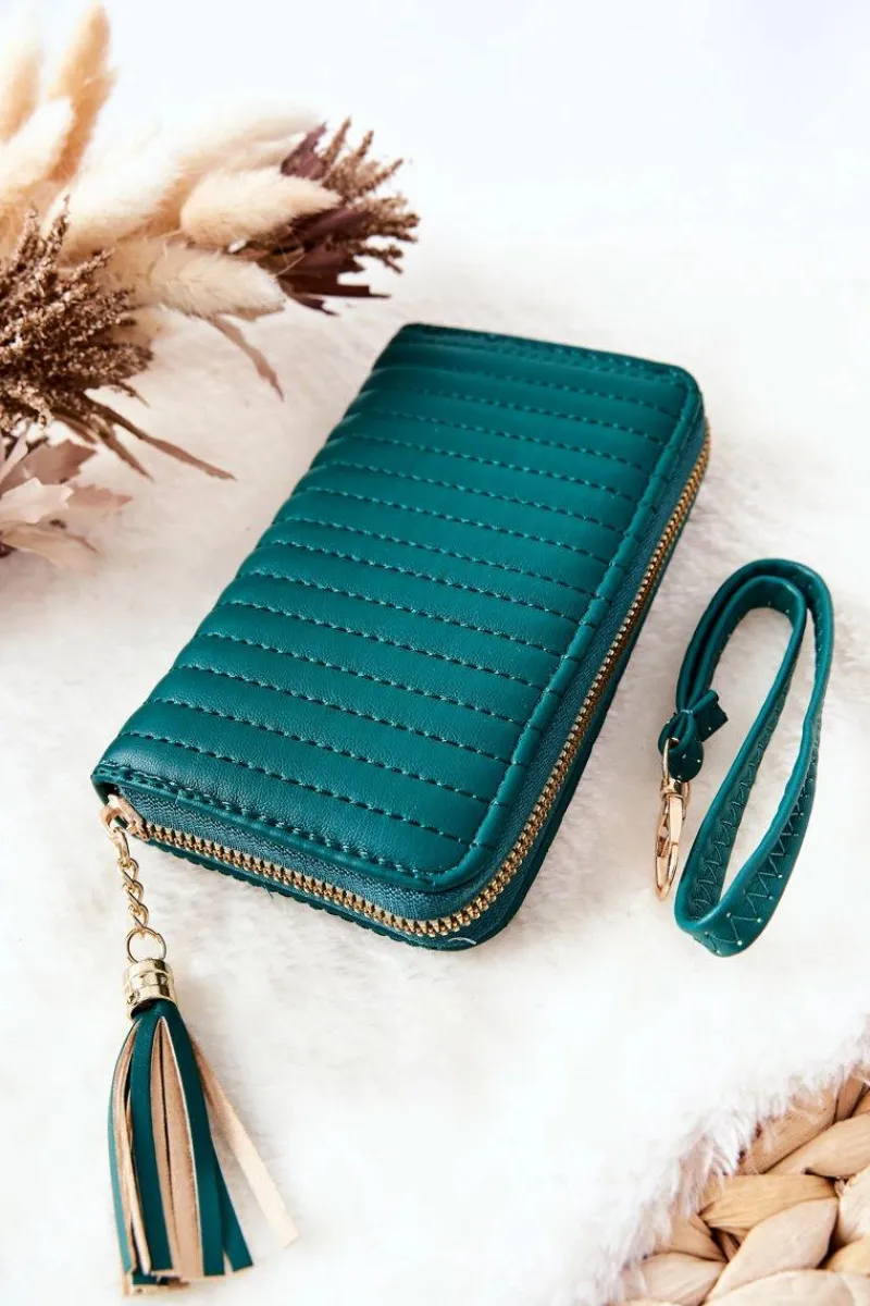 Piękny pikowany portfel zapinany na zamek. Pomieści bilony, banknoty oraz wizytówki. Wykonany ze skóry ekologicznej. W środku także posiada zamykaną na suwak kieszonkę. W zestawie dołączony odpinany pasek. Na końcu zewnętrznego suwaka jest przymocowany frędzelek. Spraw prezent sobie lub komuś bliskiemu!