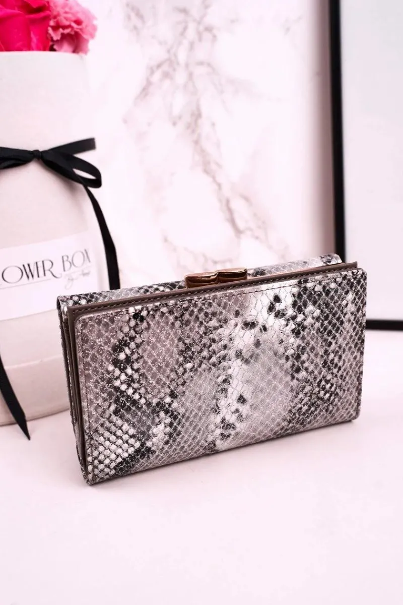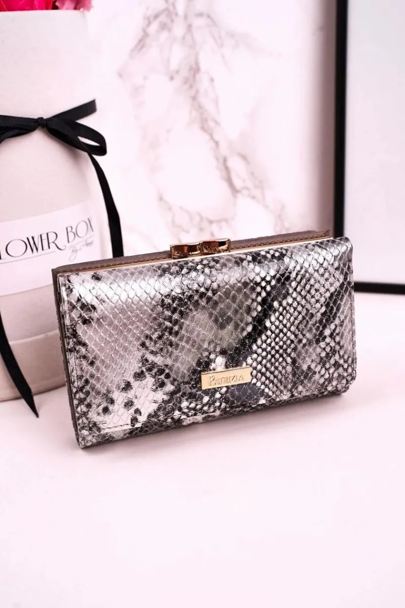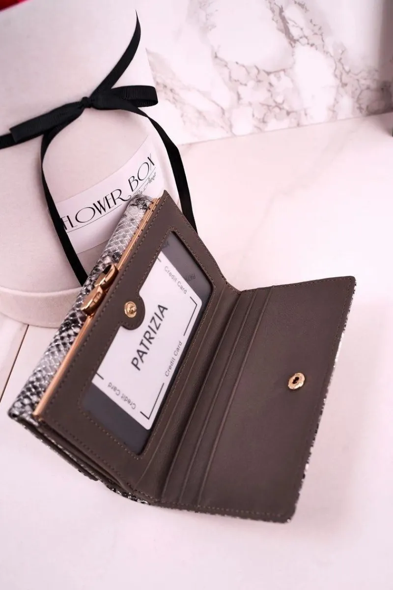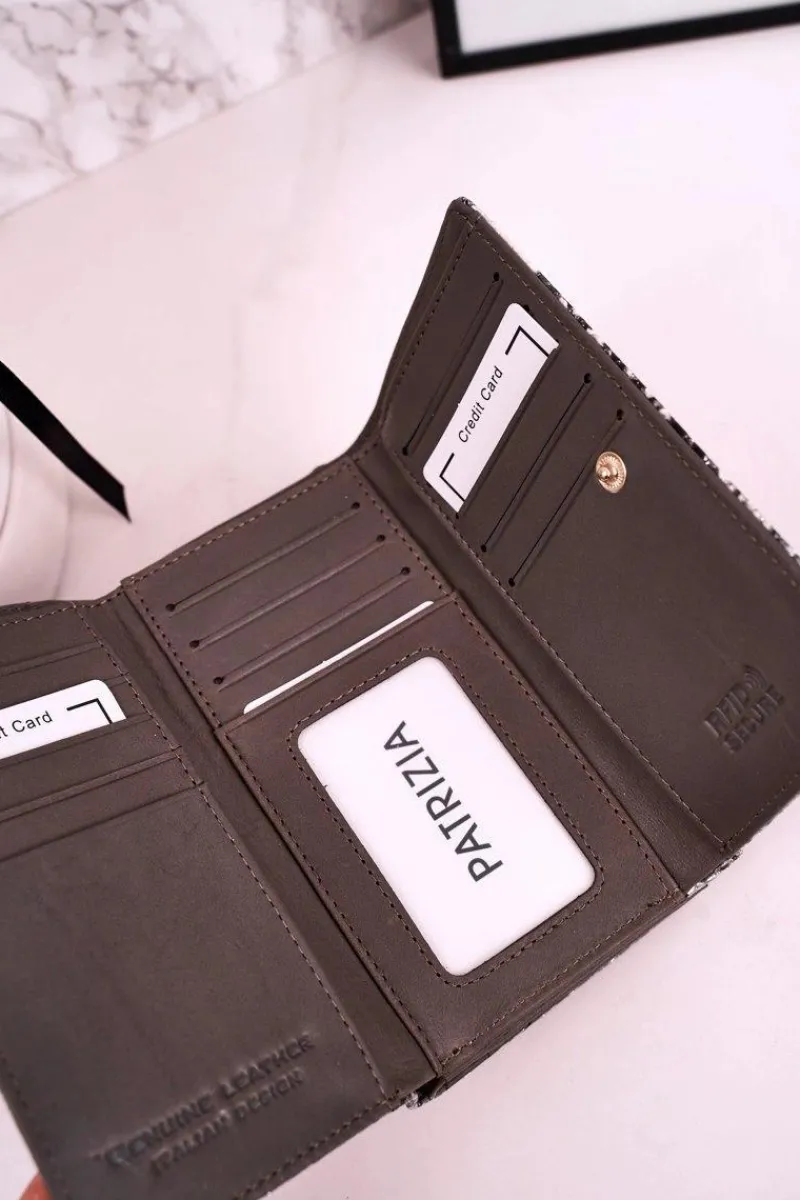 Elegancki portfel damski marki PATRIZIA. Portfel pomieści bilon, banknoty oraz karty płatnicze. Wykonany z lakierowanej skóry naturalnej, wykończony zwierzęcym printem.