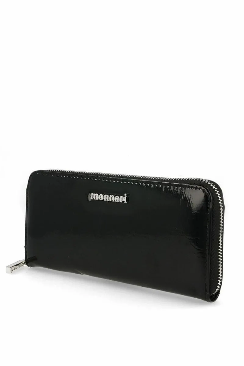Elegancki damski portfel. Klasyczny wzór wykonany z lakierowanej skóry ekologicznej. Z przodu znajduje się srebrne logo MONNARI. Portfel posiada cztery główne przegrody, dwie kieszenie na banknoty oraz jedną kieszeń zapinaną na suwak. W środku beżowa wyściółkę z napisami MONNARI .