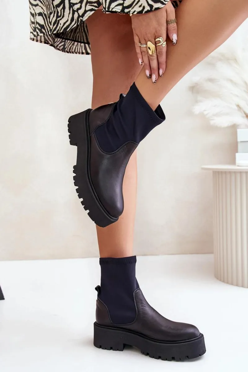 Damskie botki z cholewką za kostkę, wykonane z wysokiej jakości skóry naturalnej. Osadzone na platformie i płaskim obcasie, zapewniają wygodę podczas codziennego noszenia. Wsuwany model z zaokrąglonymi noskami łączy w sobie elegancję i komfort, doskonały na różne okazje i stylizacje. Przy wyborze rozmiaru prosimy sugerować się tabelą rozmiarów.