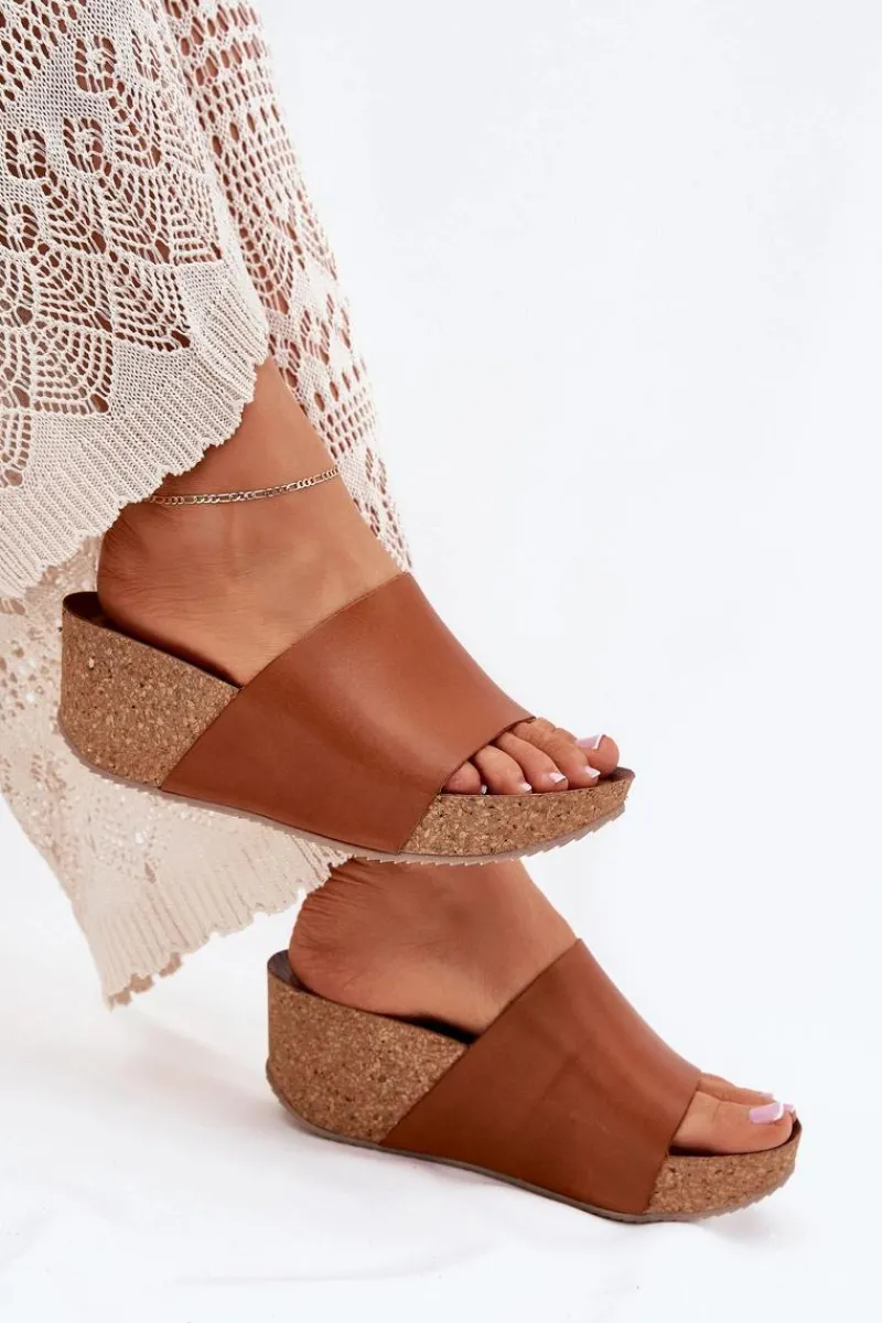 Klapki damskie na korkowym koturnie. Wykonane z wysokiej jakości skóry naturalnej, zapewniają trwałość i komfort noszenia. Modny fason, który będzie idealnym wyborem na letnie dni. Przy wyborze rozmiaru prosimy sugerować się tabelą rozmiarów.
