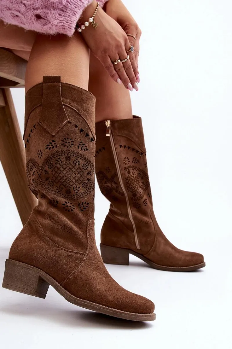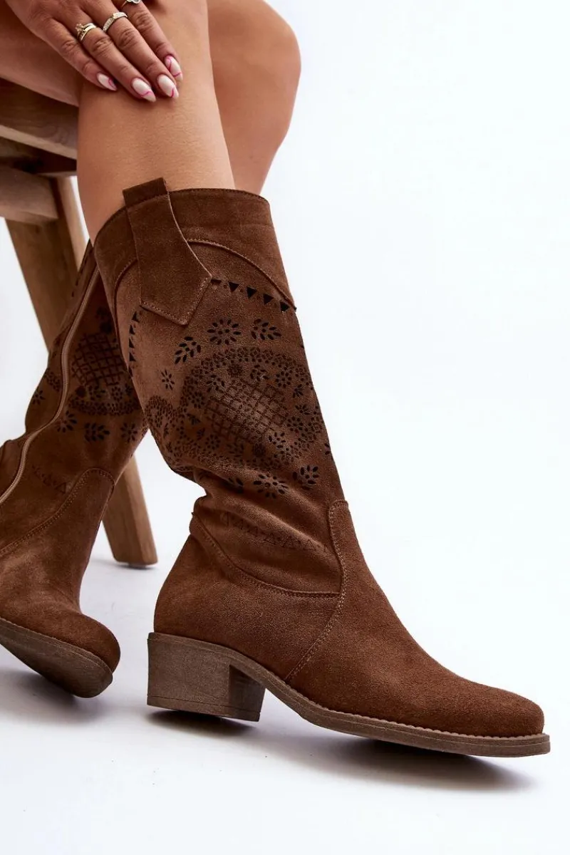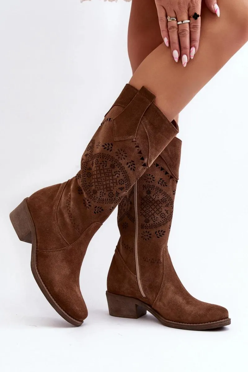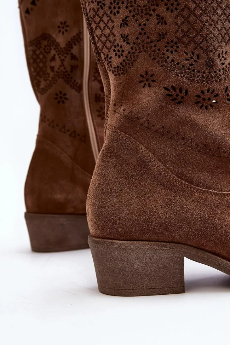 Sale 4043 Zamszowe Kozaki Na Niskim Obcasie Ażurowe Brązowe Damskie Kozaki Wiosenne|Kozaki Ażurowe