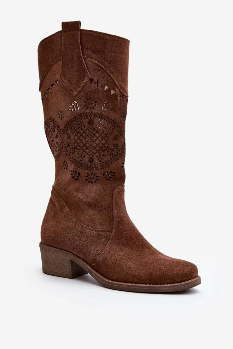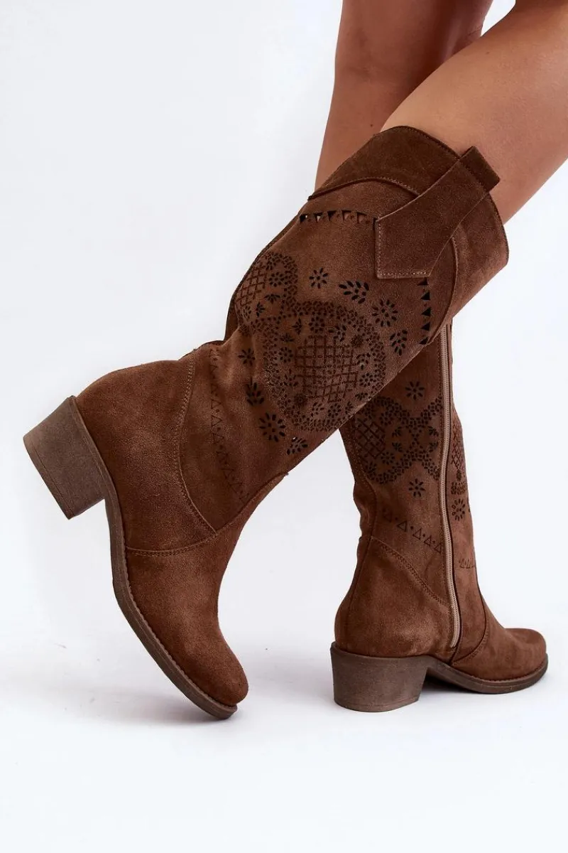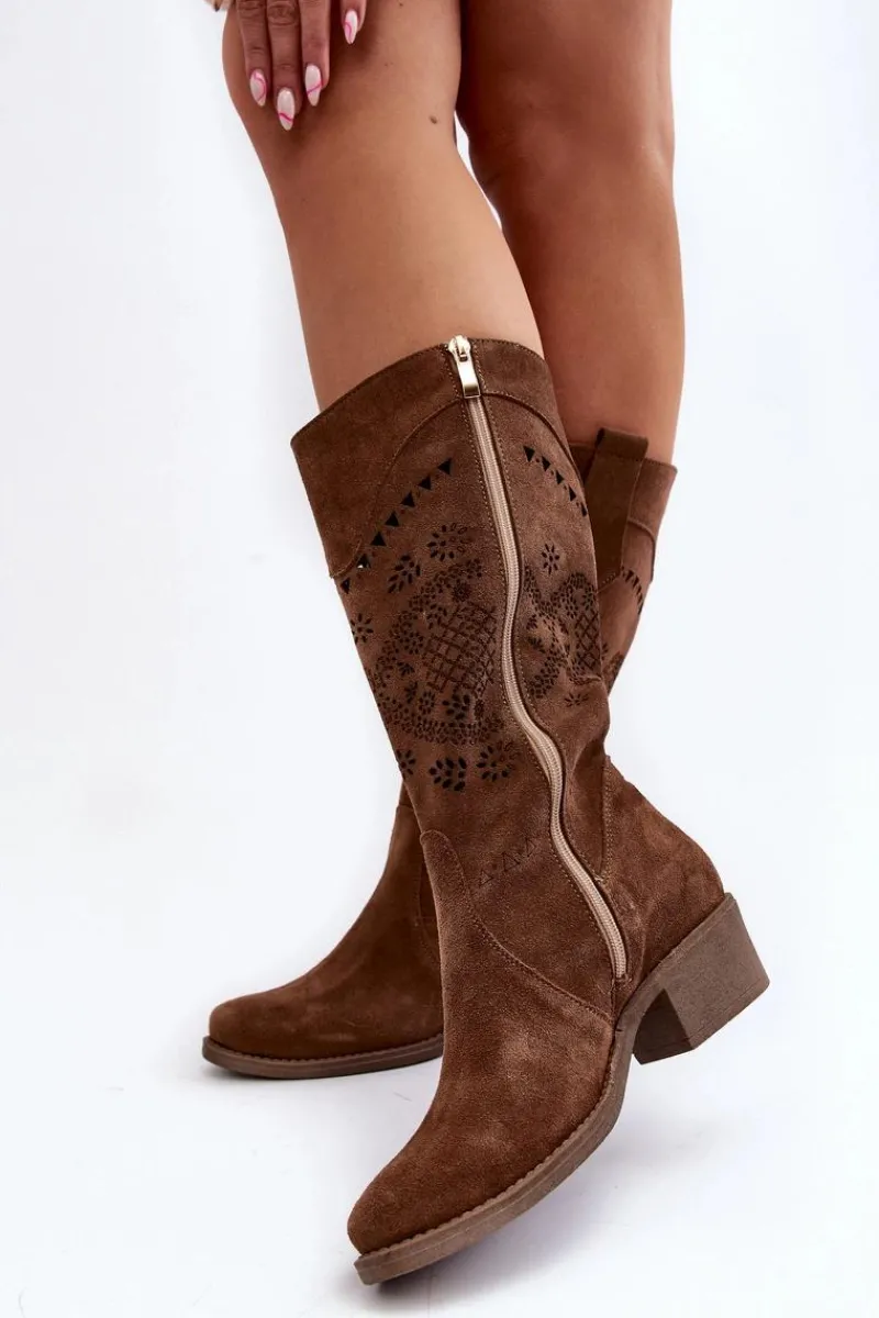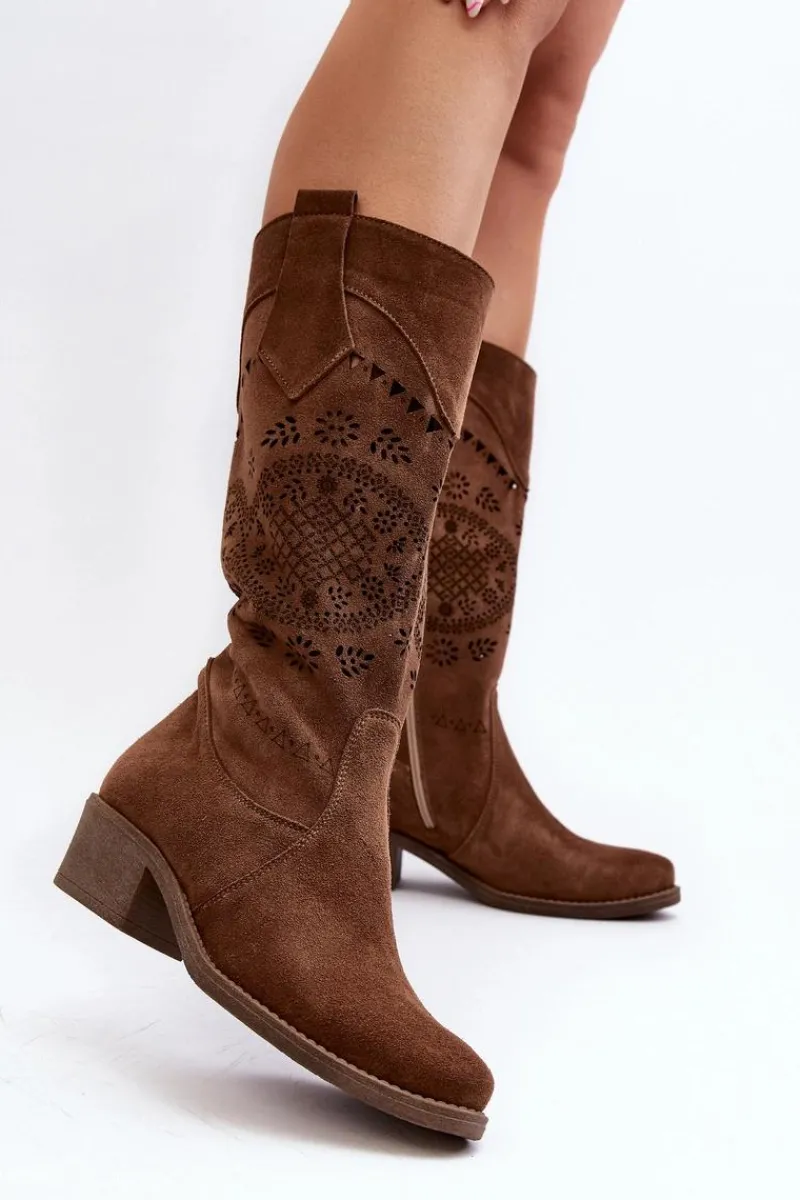 Sale 4043 Zamszowe Kozaki Na Niskim Obcasie Ażurowe Brązowe Damskie Kozaki Wiosenne|Kozaki Ażurowe