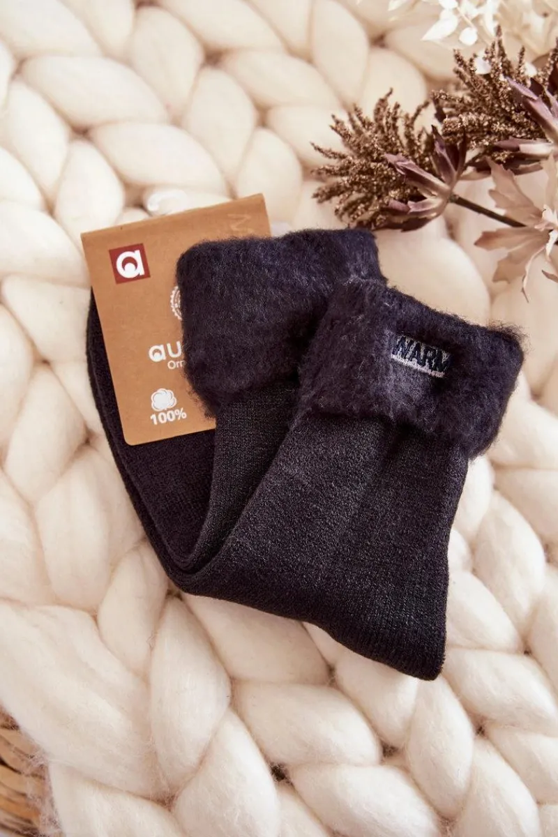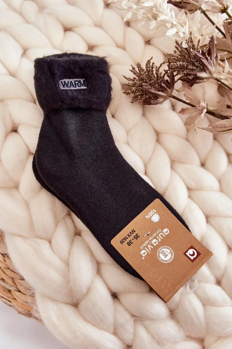 Bawełniane skarpetki w dwóch grupach rozmiarowych idealnie sprawdzą się dla każdego, kto ceni sobie ciepło i komfort podczas chłodniejszych dni. Posiadają ocieplenie w postaci delikatnego futerka. Z boku skarpetek znajduje się ozdobny napis.