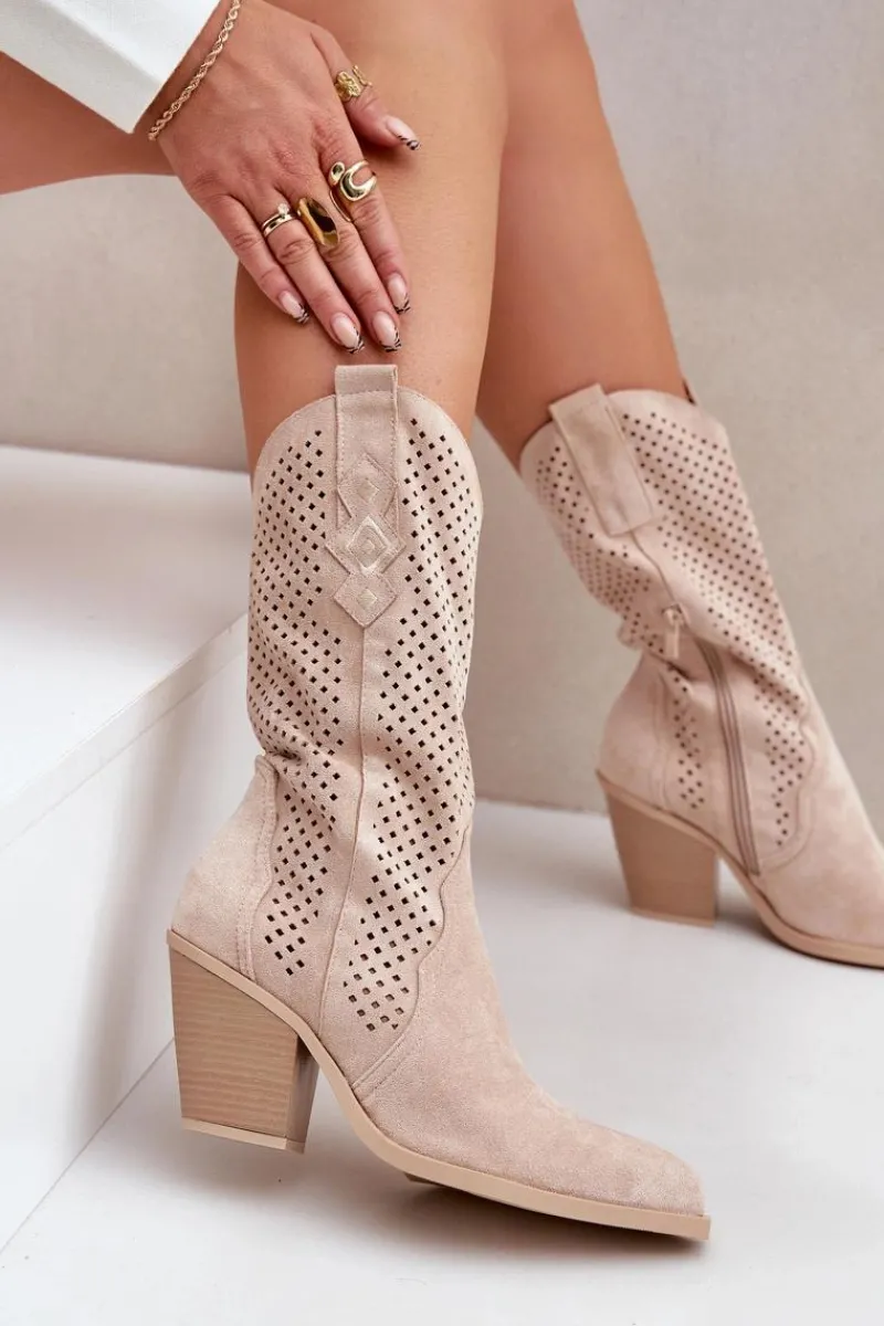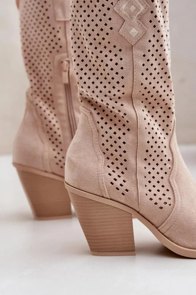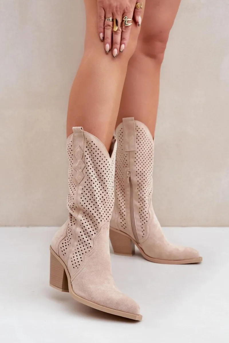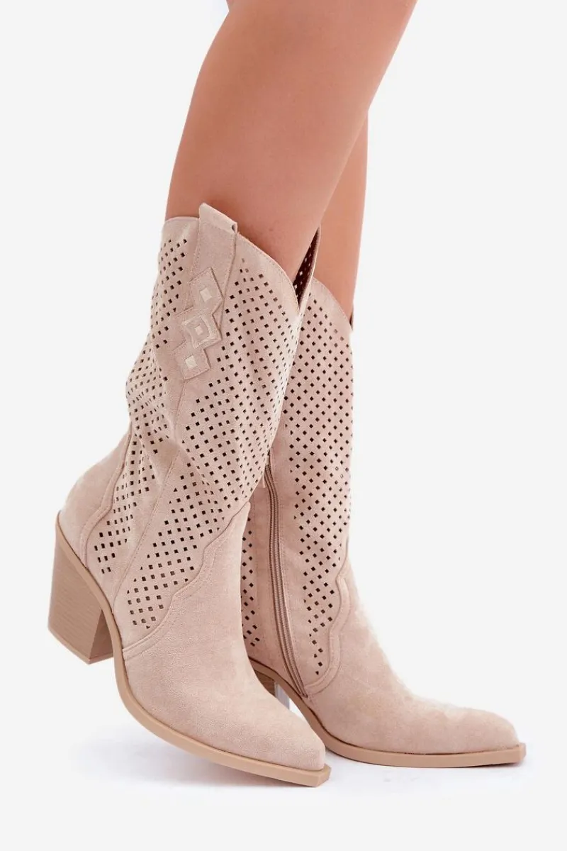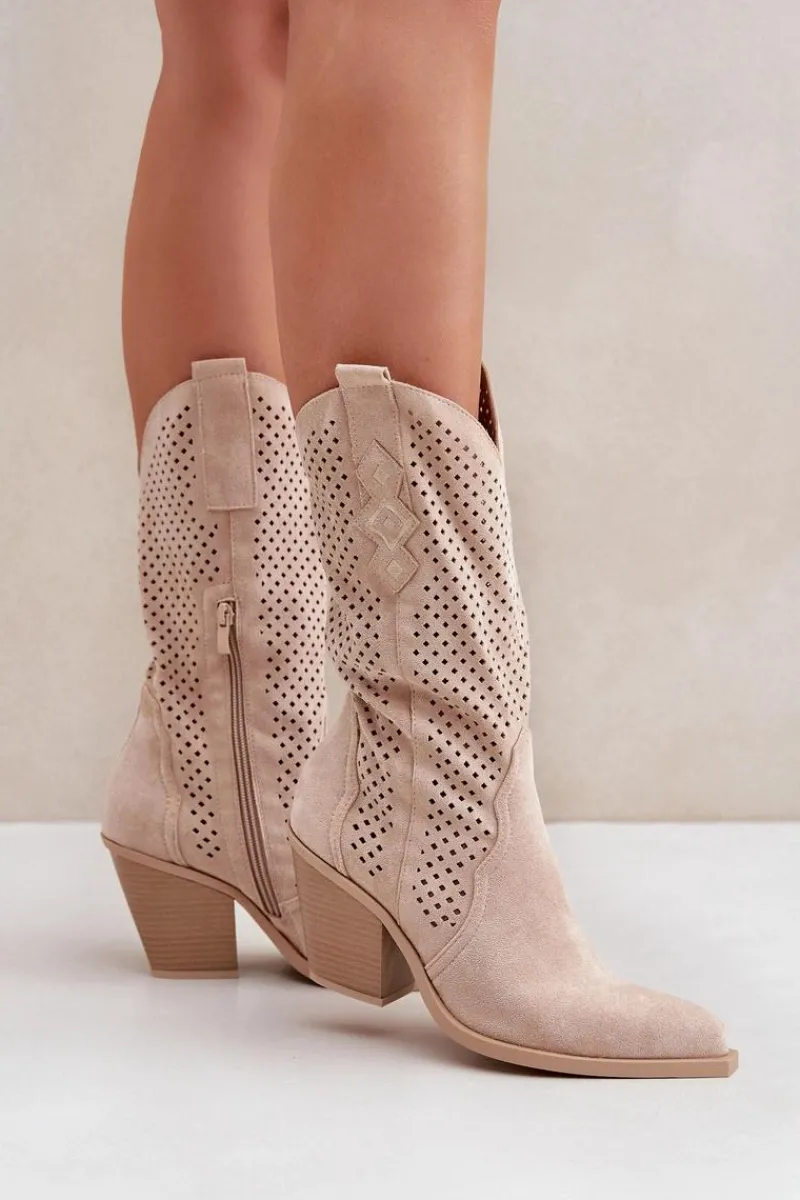 Botki kowbojki to wyjątkowy model dla kobiet, które cenią sobie połączenie stylu i komfortu. Ażurowa cholewka dodaje unikalnego charakteru. Miękka wkładka wykonana z eko skóry zapewnia doskonały komfort noszenia, dbając o stopy nawet podczas długiego użytkowania. Stabilny obcas słupek łączy elegancję z praktycznością, umożliwiając swobodne poruszanie się. Model wsuwany z dodatkowym zapięciem na zamek gwarantuje łatwe zakładanie oraz idealne dopasowanie do stopy. Szpiczaste noski podkreślają kobiecość i dodają wyrafinowanego wyglądu. Stylowe botki kowbojki doskonale komponują się zarówno z jeansami, jak i bardziej eleganckimi stylizacjami, nadając im wyrazisty i modny akcent. Idealne na każdą okazję, te botki są must-have w każdej garderobie! Przy wyborze rozmiaru prosimy sugerować się tabelą rozmiarów.
