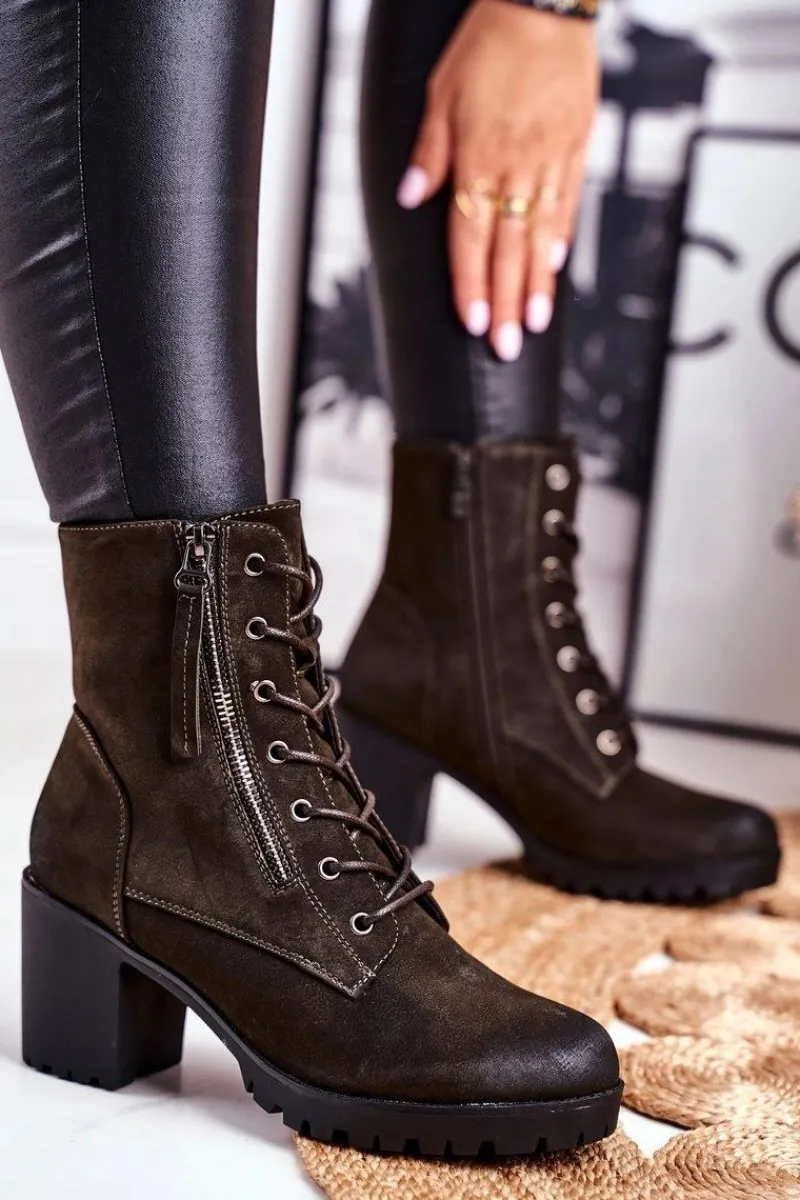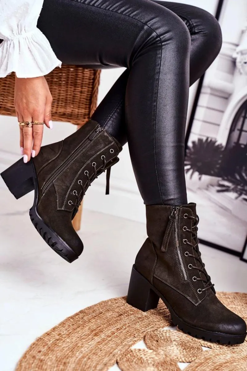 Sale Botki Damskie Na Słupku Ocieplane Khaki Vimen Damskie Botki Sznurowane|Botki Na Słupku