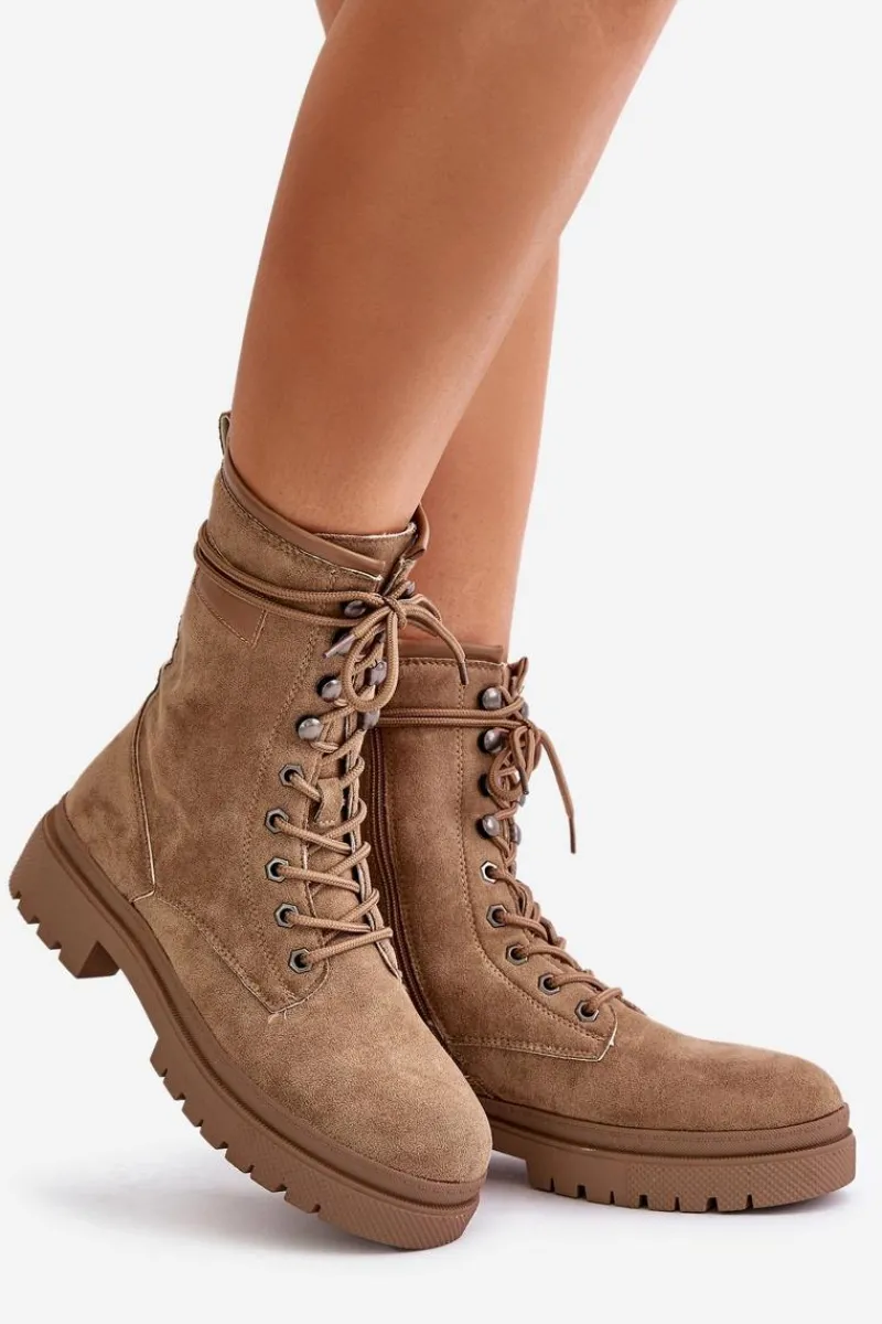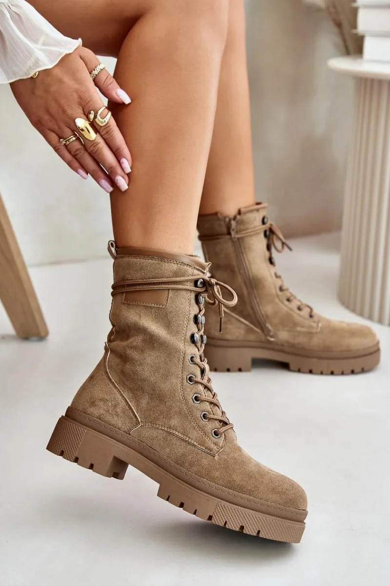Workery damskie wykonane z eko zamszu. Osadzone na płaskim obcasie. Noski zaokrąglone. Zapinane na zamek oraz sznurowane. Klasyczny, modny fason, który dopełni wiele jesiennych stylizacji! Przy wyborze rozmiaru prosimy sugerować się tabelą rozmiarów.