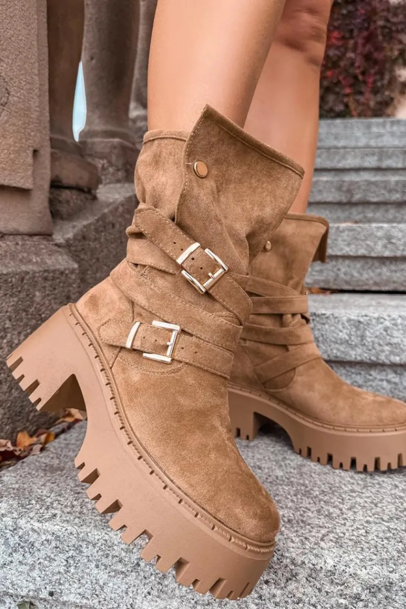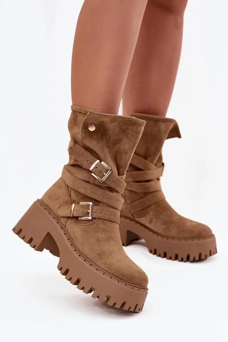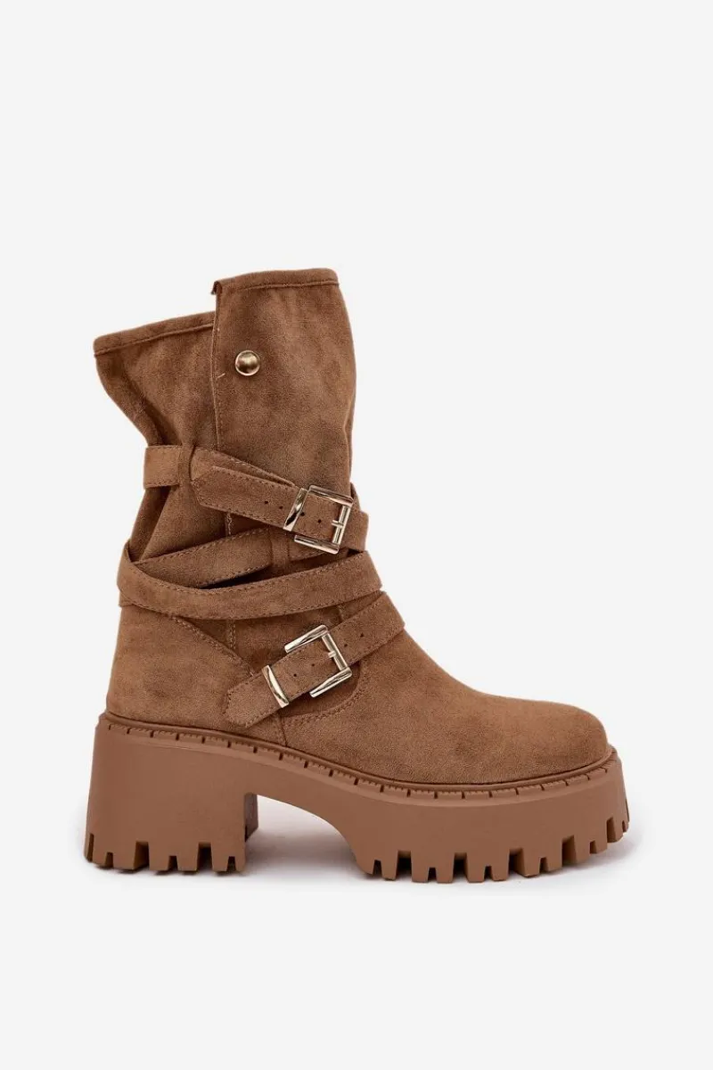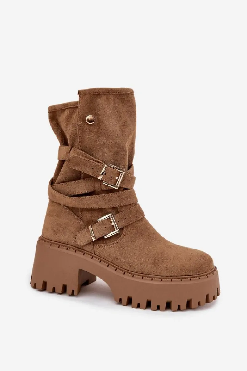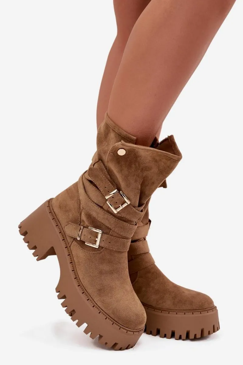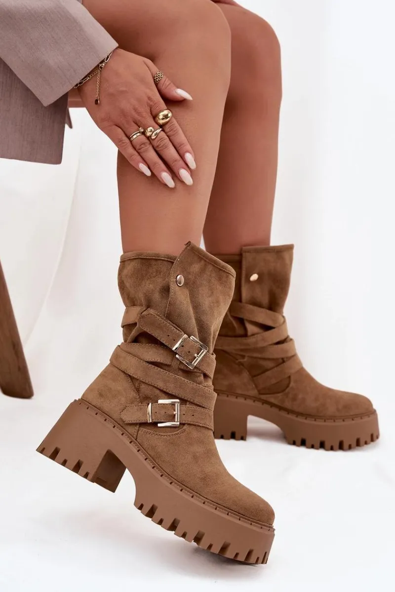 Botki damskie wykonane z eko zamszu. Osadzone na masywnym obcasie, który zapewni stabilność na każdym kroku. Noski zaokrąglone. Model ten wyróżnia się paskiem oplecionym wokół cholewki ze złotymi klamrami. Góra cholewki zapinana na dwa zatrzaski. Bez względu na okazję, te botki będą doskonałym uzupełnieniem Twojej garderoby! Przy wyborze rozmiaru prosimy sugerować się tabelą rozmiarów.