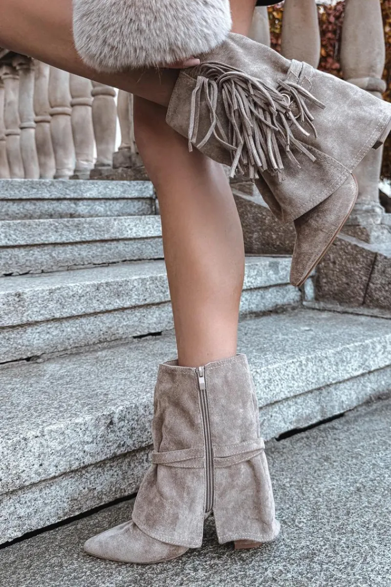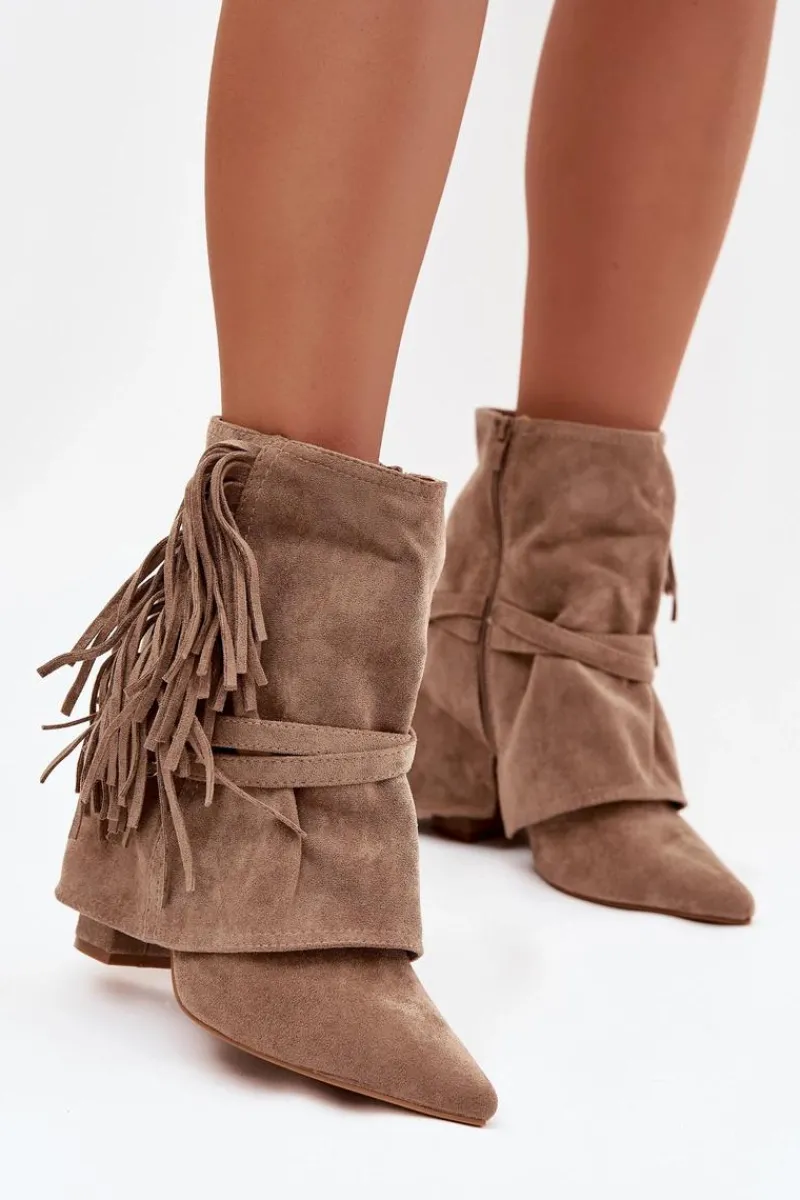 Damskie botki z eko zamszu to idealne połączenie stylu i oryginalnych detali, które przyciągają uwagę. Cholewka nachodząca na obcas subtelnie wysmukla sylwetkę, a szpiczaste noski dodają elegancji i kobiecego charakteru. Model ozdobiony frędzlami oraz cienkimi paseczkami ze złotymi klamrami wprowadza modowy akcent, nadając wyjątkowego, nowoczesnego wyglądu. Botki doskonale sprawdzą się w casualowych zestawach, jak i w bardziej wyjściowych stylizacjach, wprowadzając do nich nutę oryginalności i szyku. Komfortowe i efektowne, stanowią świetny wybór na co dzień i na specjalne okazje.Przy wyborze rozmiaru prosimy sugerować się tabelą rozmiarów.