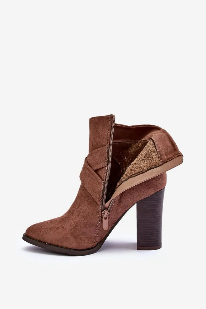 Eleganckie botki za kostkę wykonane z eko zamszu. Osadzone na wysokim obcasie w postaci słupka. Cholewka ozdobiona paskami z klamrą. Model zapinany na suwak. Zapiętek usztywniony, wnętrze ocieplone kocem obuwniczym. Idealny model do eleganckich i imprezowych stylizacji. Przy wyborze rozmiaru prosimy sugerować się tabelą rozmiarów.