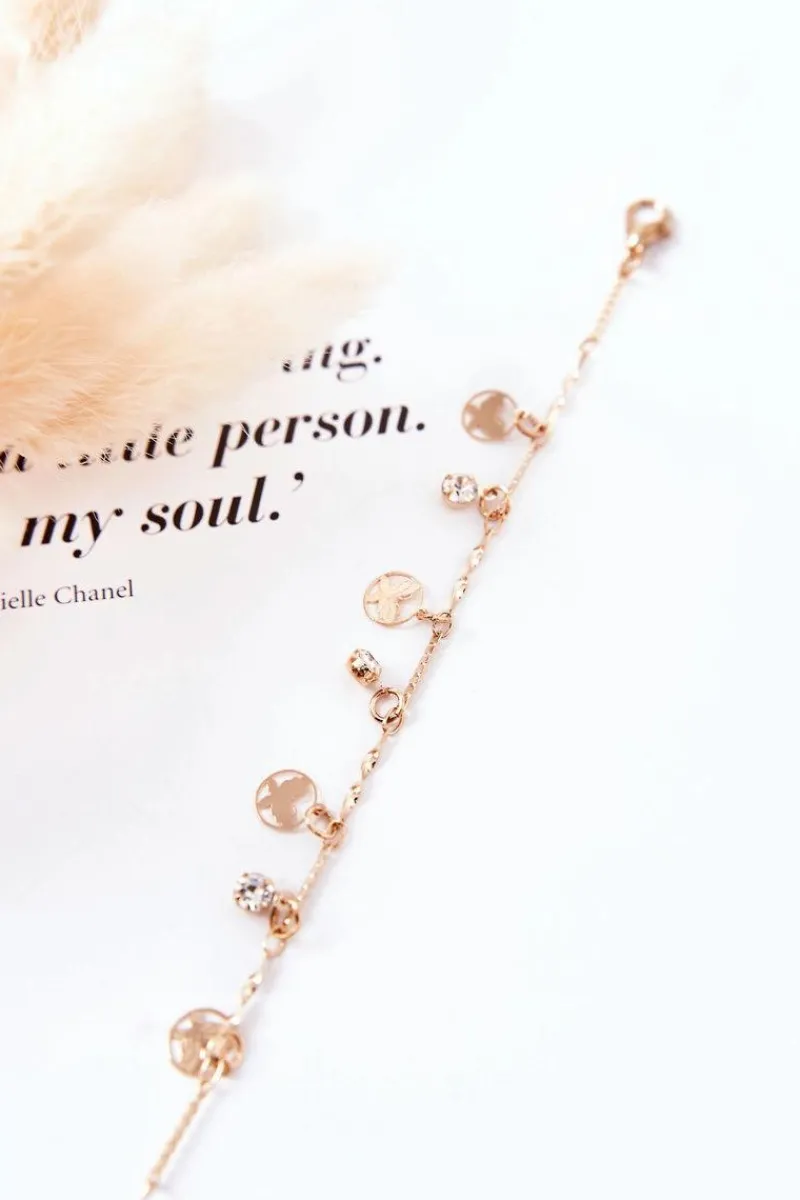 Bransoletka z ozdobnymi zawieszkami w postaci cyrkonii oraz motywu motyla. Została wykonana z metalu nieszlachetnego. Posiada możliwość regulacji długości. Cienki łańcuszek w bransoletce bardzo dobrze prezentuje się na nadgarstku. Nie czekaj aż zniknie i kup już dziś! Ten model musi być Twój!