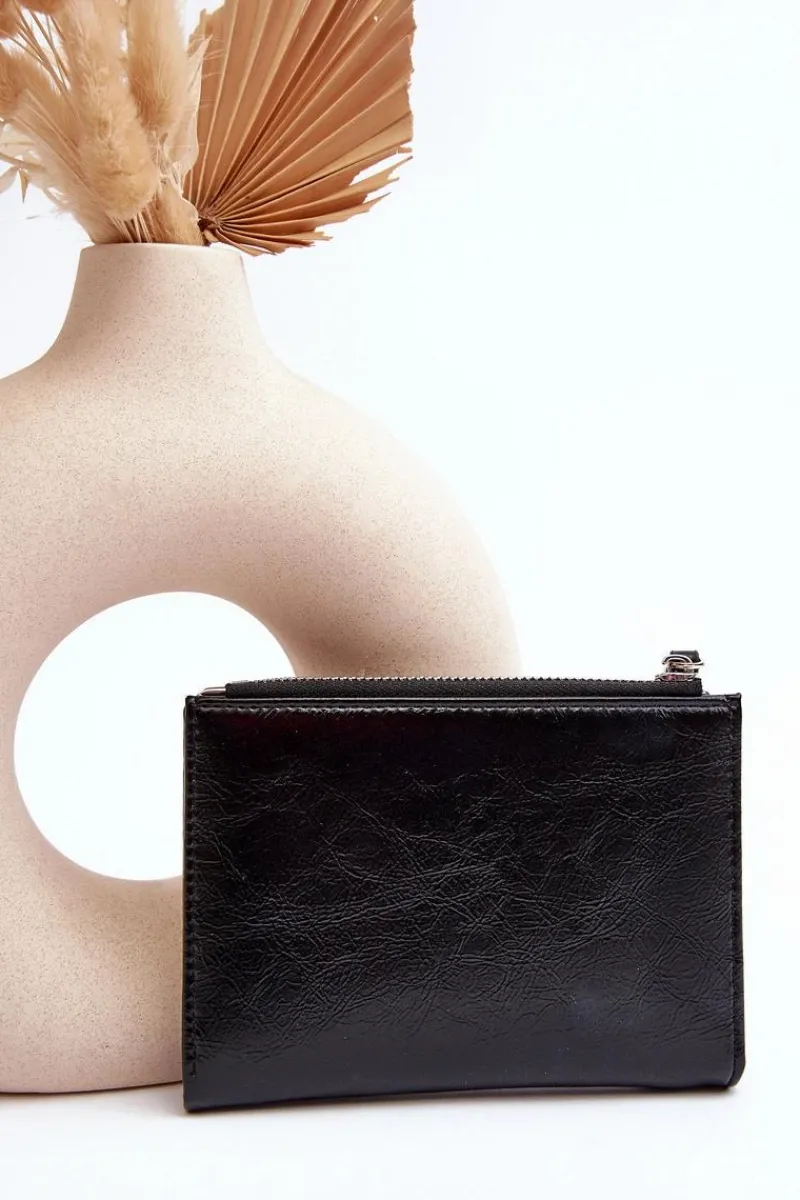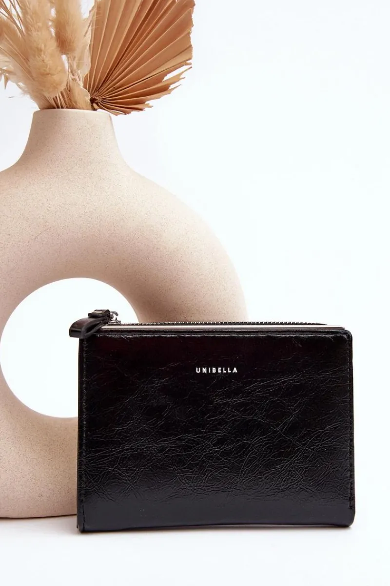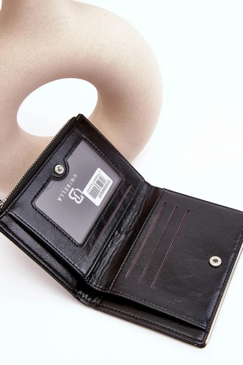 Portfel damski wykonany z połyskującej eko skóry. Zapinany na zatrzask oraz suwak. W środku miejsce na banknoty, karty, fotografię. Model ten posiada osobną kieszeń na monety. Doskonale sprawdzi się jako prezent!