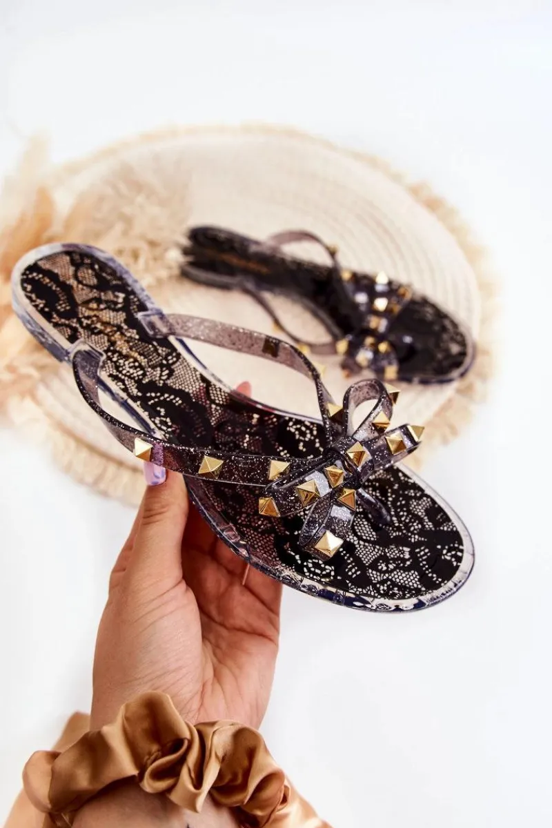 Wyjątkowe klapki o fasonie japonek zostały wykonane z gumowego tworzywa. Posiadają ozdobne elementy na paskach w postaci ćwieków. Na przodzie znajduje się urocza kokardka. Wkładka została wykonana z tworzywa sztucznego. Buty osadzone na płaskim obcasie. Ten model świetnie sprawdzi się podczas upalnych dni! Koniecznie musisz je mieć!