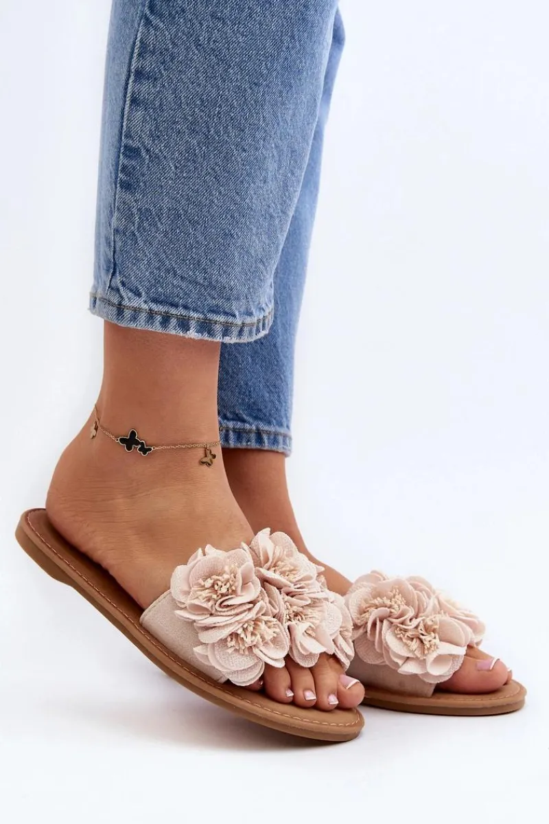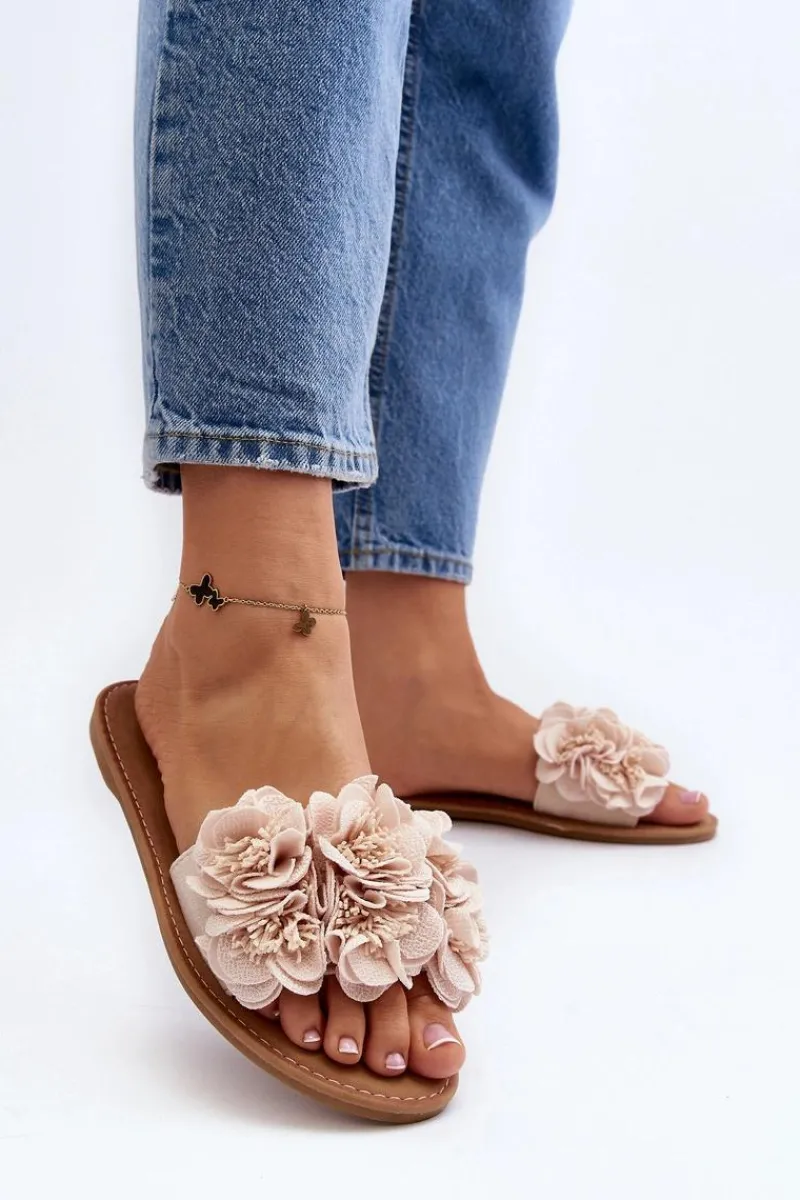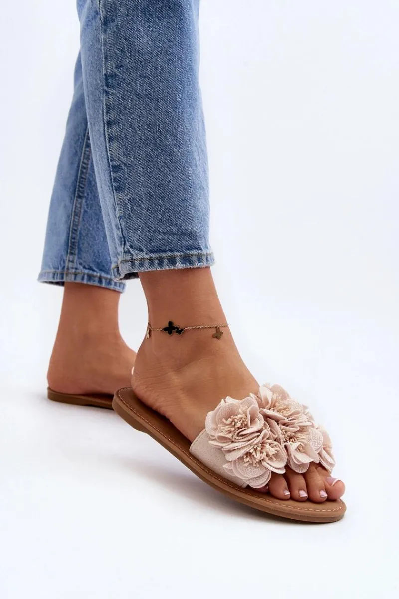 Te urocze klapki to doskonały dodatek do Twojej letniej garderoby. Ich płaski obcas zapewnia wygodę podczas noszenia, co sprawia, że są idealne na letnie spacery czy spotkania ze znajomymi. Przód ozdobiony kwiatkami z tkaniny nadaje im delikatności i dziewczęcego uroku, co doskonale komponuje się z letnim klimatem. Dodatkowo miękka wkładka z eko skóry zapewnia wygodę i komfort podczas użytkowania, nawet przez dłuższy czas. Przy wyborze rozmiaru prosimy sugerować się tabelą rozmiarów.