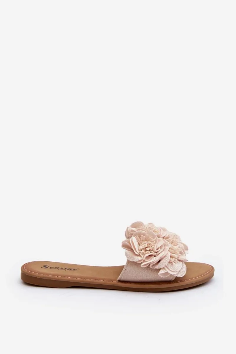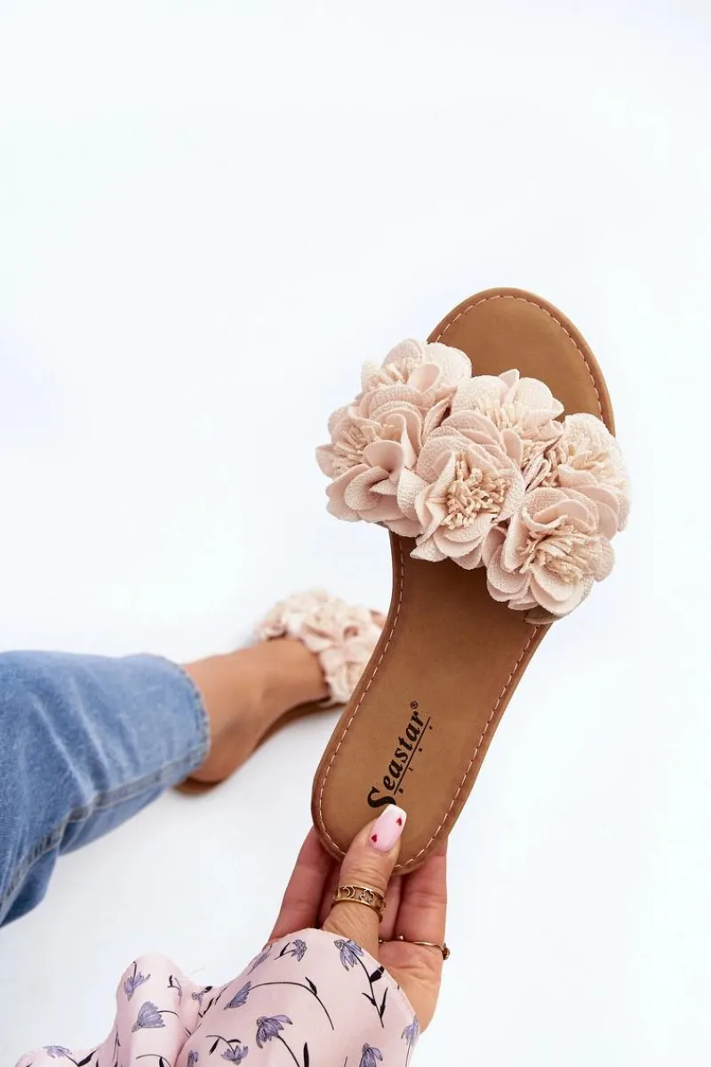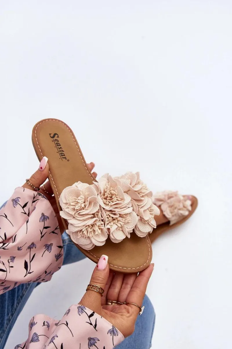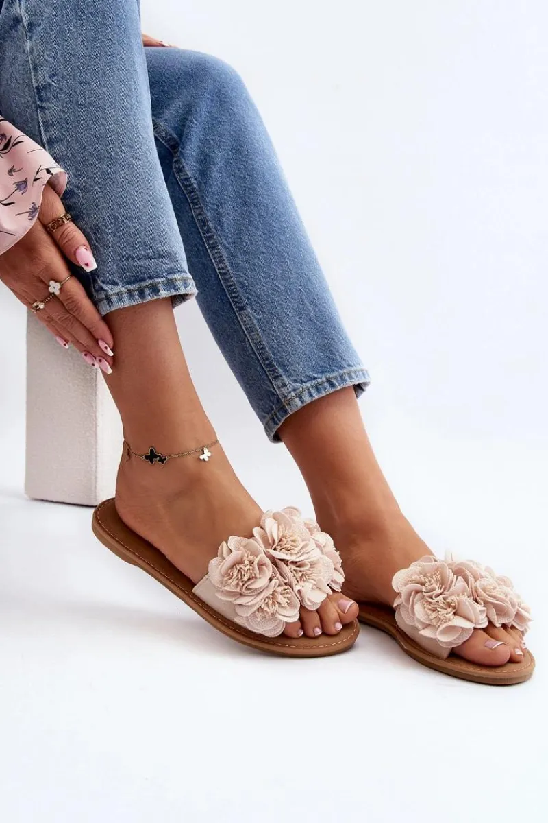 Te urocze klapki to doskonały dodatek do Twojej letniej garderoby. Ich płaski obcas zapewnia wygodę podczas noszenia, co sprawia, że są idealne na letnie spacery czy spotkania ze znajomymi. Przód ozdobiony kwiatkami z tkaniny nadaje im delikatności i dziewczęcego uroku, co doskonale komponuje się z letnim klimatem. Dodatkowo miękka wkładka z eko skóry zapewnia wygodę i komfort podczas użytkowania, nawet przez dłuższy czas. Przy wyborze rozmiaru prosimy sugerować się tabelą rozmiarów.