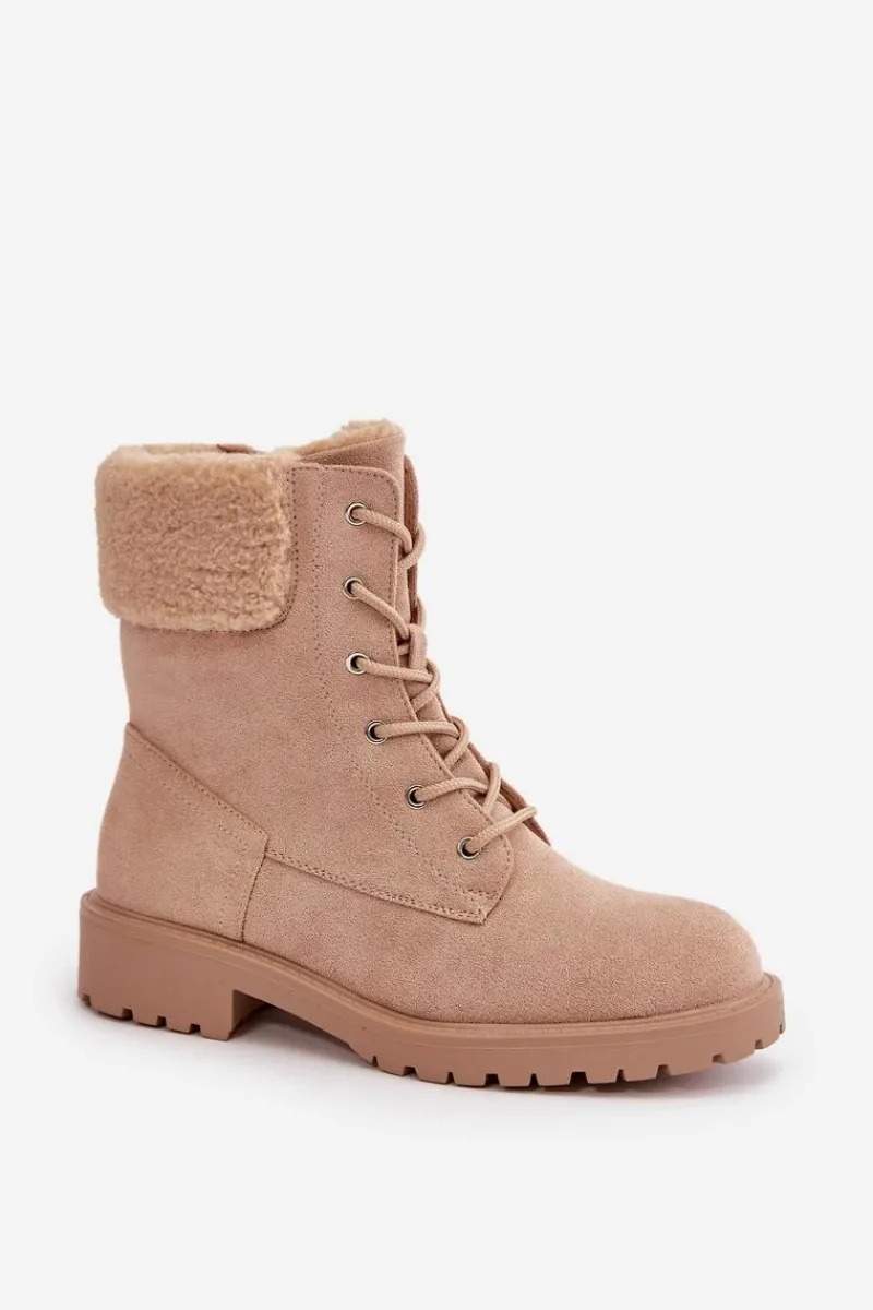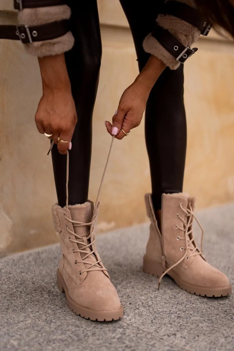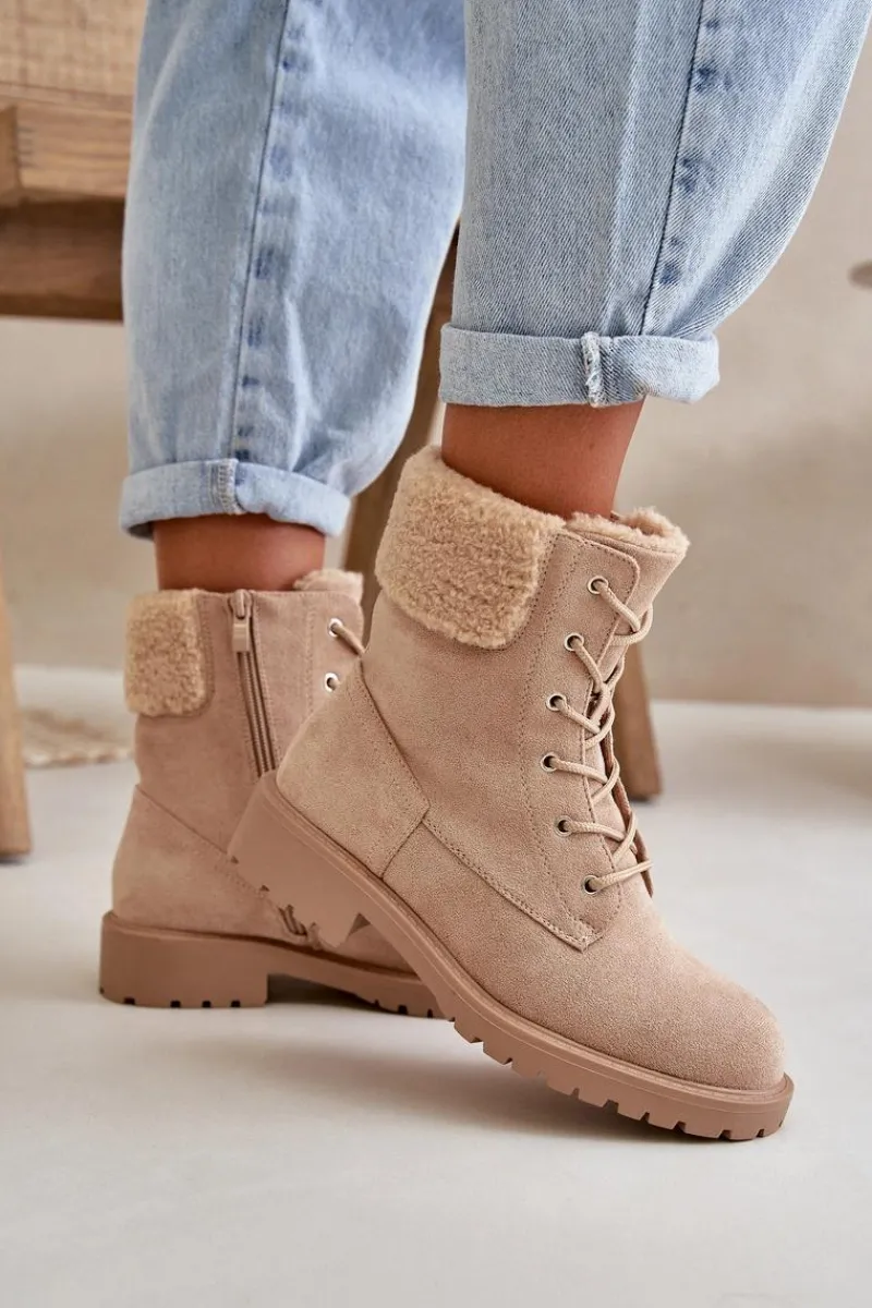 Damskie botki wykonane z miękkiego eko zamszu. Wnętrze ocieplone kocem obuwniczym, co zapewnia komfort w chłodniejsze dni. Góra ozdobiona stylowym kożuszkiem. Model sznurowany, z dodatkowym zapięciem na zamek, co ułatwia zakładanie i dopasowanie do stopy. Idealne na jesienno-zimowe spacery i codzienne stylizacje. Przy wyborze rozmiaru prosimy sugerować się tabelą rozmiarów.