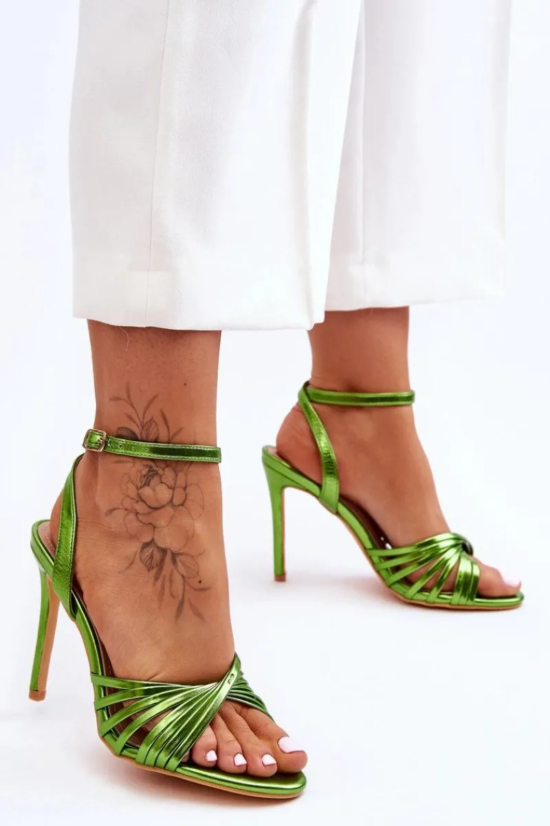 Te piękne sandałki damskie osadzono na obcasie w postaci szpilki. Model ten został wykonany z eko skóry. Sandałki posiadają na przodzie związane paseczki. Zapinane wokół kostki na regulowany pasek ze sprzączką. Te eleganckie sandałki z pewnością sprawdzą się w wielu stylizacjach na różnego rodzaju imprezy, spotkania czy uroczystości! Przy wyborze rozmiaru prosimy sugerować się tabelą rozmiarów.