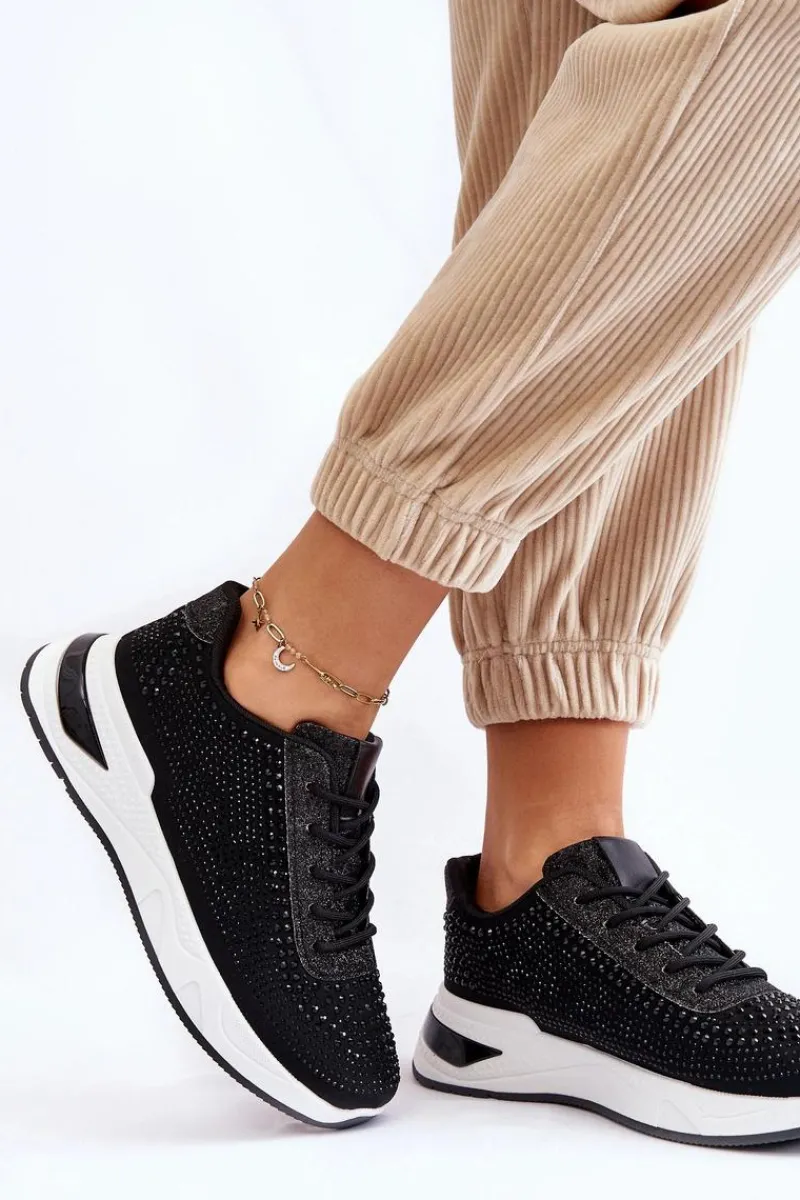 Klasyczne, damskie buty sportowe zostały wykonane z materiału tekstylnego. Dodatkowo posiadają zdobienia w postaci dżetów imitujących cyrkonie. Zostały osadzone na platformie. Model ten posiada klasyczne sznurowanie. Miękka wkładka wykonana z materiału zapewni wygodę podczas użytkowania. Koniecznie powinnaś je mieć! Przy wyborze rozmiaru prosimy kierować się tabelą rozmiarów.