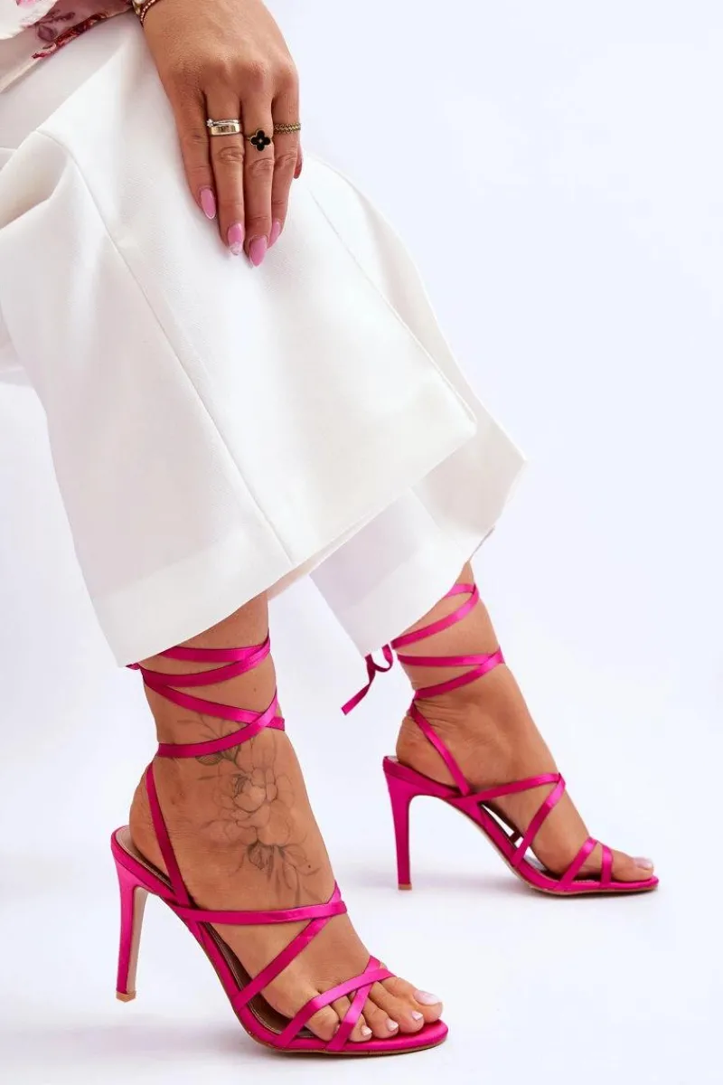 Klasyczne, damskie sandałki zostały wykonane z materiału tekstylnego. Osadzone na obcasie w postaci szpilki. Sandałki posiadają miękką, eko skórzaną wkładkę. Idealne na upalne dni, dzięki przewiewnemu fasonowi. Sandałki posiadają odkryty, lekko zaokrąglony nosek. Model ten jest wiązany wokół łydki. Przy wyborze rozmiaru prosimy sugerować się tabelą rozmiarów.