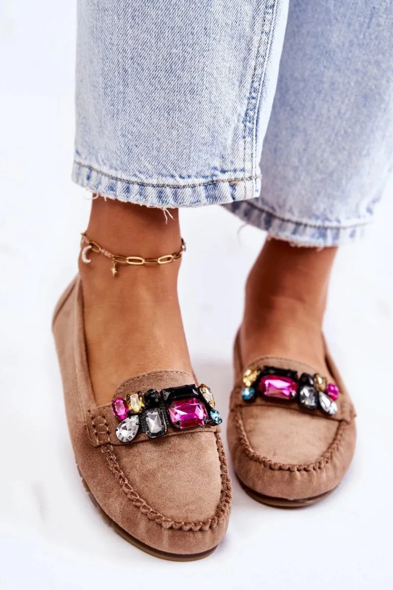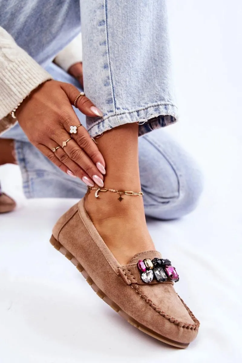 Damskie mokasyny zostały wykonane z miłego w dotyku eko zamszu. Na przodzie znajdują się ozdobne kamienie. Mokasyny zostały osadzone na delikatnej platformie, z antypoślizgową podeszwą. Zapiętek jest delikatnie usztywniany. Miękka wkładka jest dodatkowo perforowana i wykonana z naturalnej skóry. Świetny model do wielu stylizacji! Przy wyborze rozmiaru prosimy sugerować się tabelą rozmiarów.