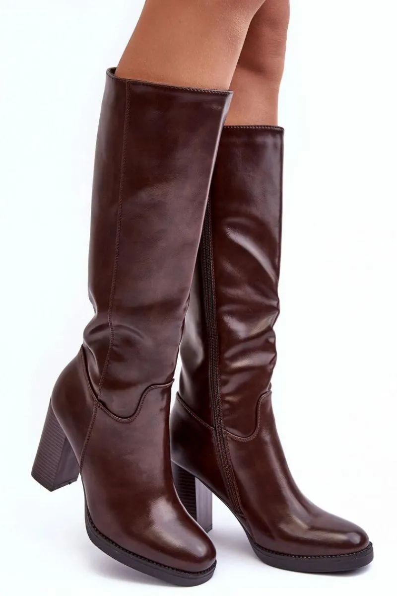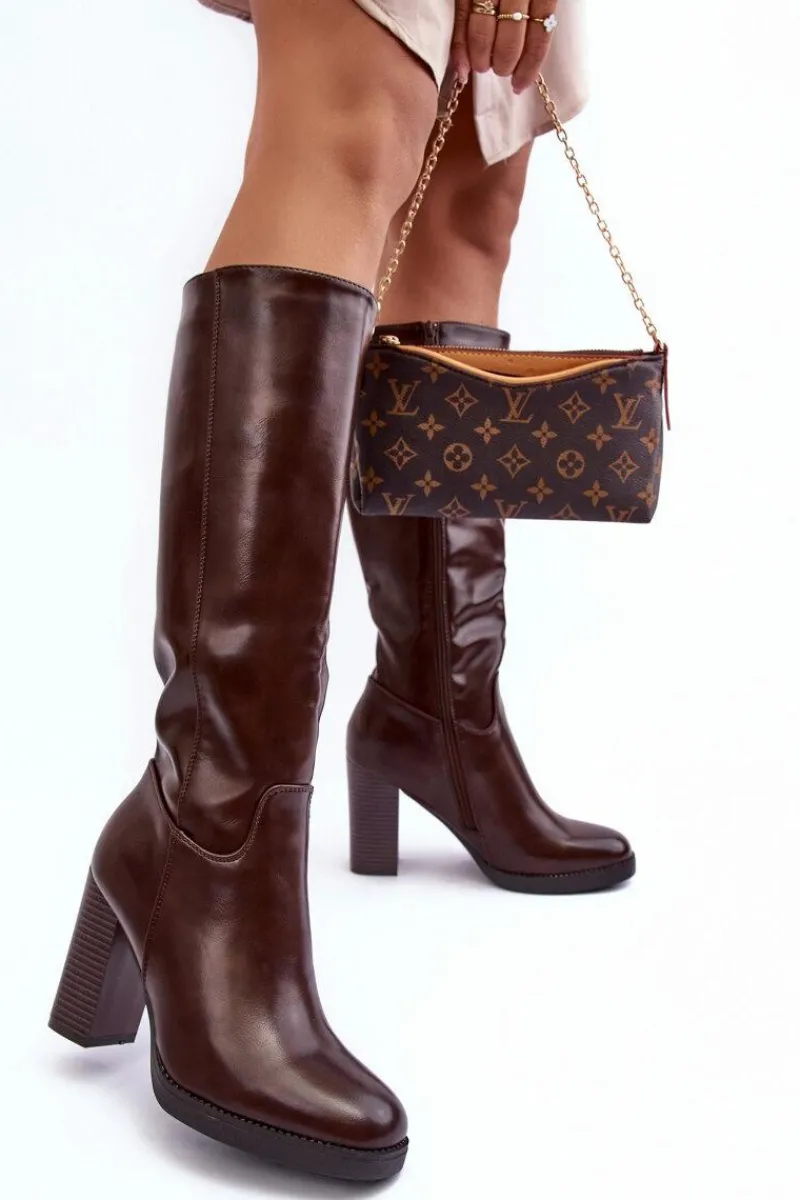 Eleganckie kozaki damskie z cholewką przed kolano. Wykonane z eko skóry. Osadzone na obcasie w postaci słupka. Zapinane na suwak po wewnętrznej stronie cholewki. Środek ocieplony kocem obuwniczym. Zapiętek w tym obuwiu jest usztywniony. Wykorzystasz je w wielu stylizacjach! Przy wyborze rozmiaru prosimy sugerować się tabelą rozmiarów.