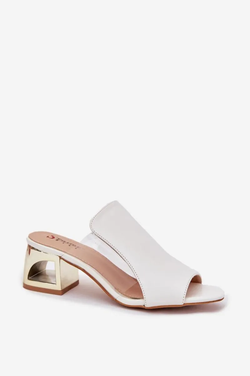 Klapki damskie z eko skóry, osadzone na złotym słupkowym obcasie, to elegancka propozycja na cieplejsze dni. Połączenie klasycznego materiału z nowoczesnym akcentem złotego obcasa sprawia, że idealnie pasują do sukienek oraz spodni materiałowych, dodając stylu i szyku każdej stylizacji. Komfort i modny wygląd w jednym! Przy wyborze rozmiaru prosimy kierować się tabelą rozmiarów.