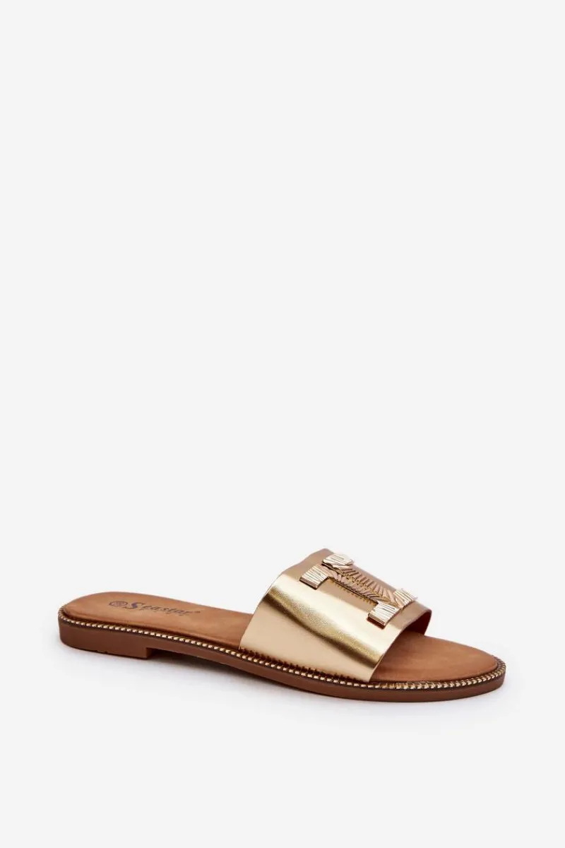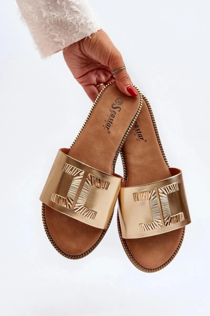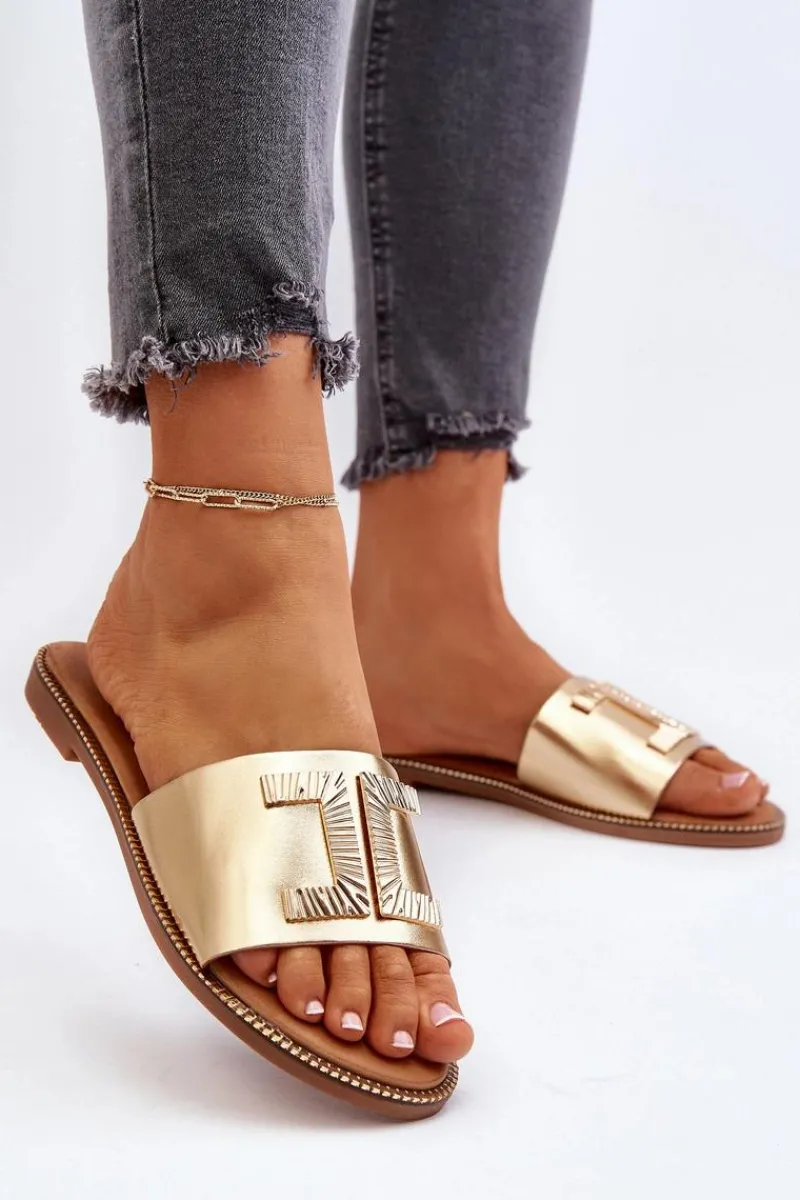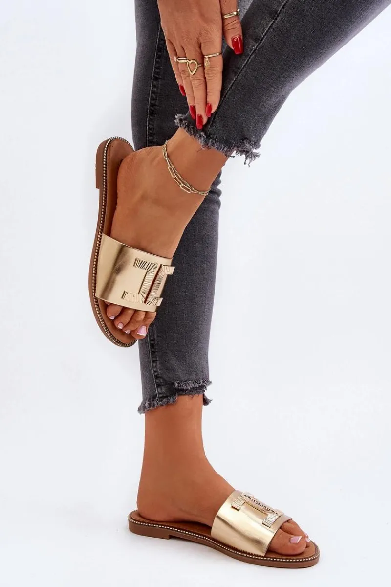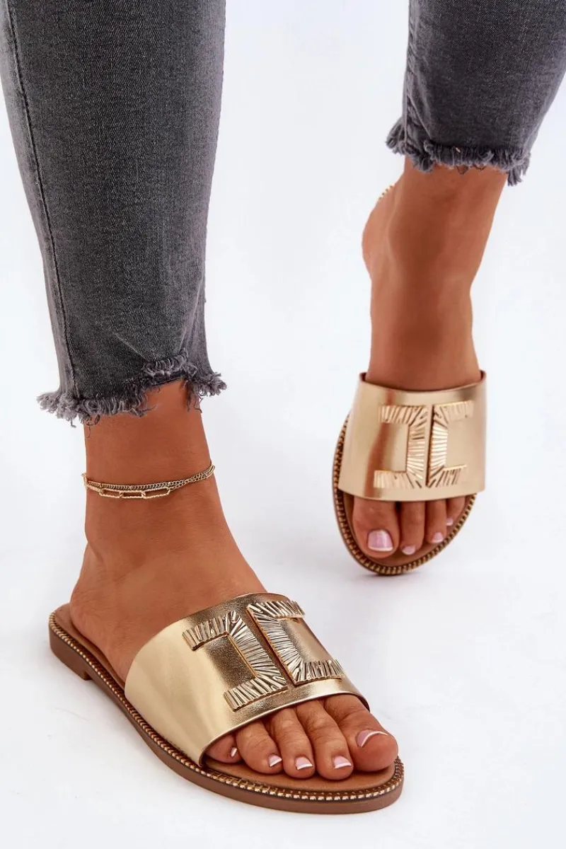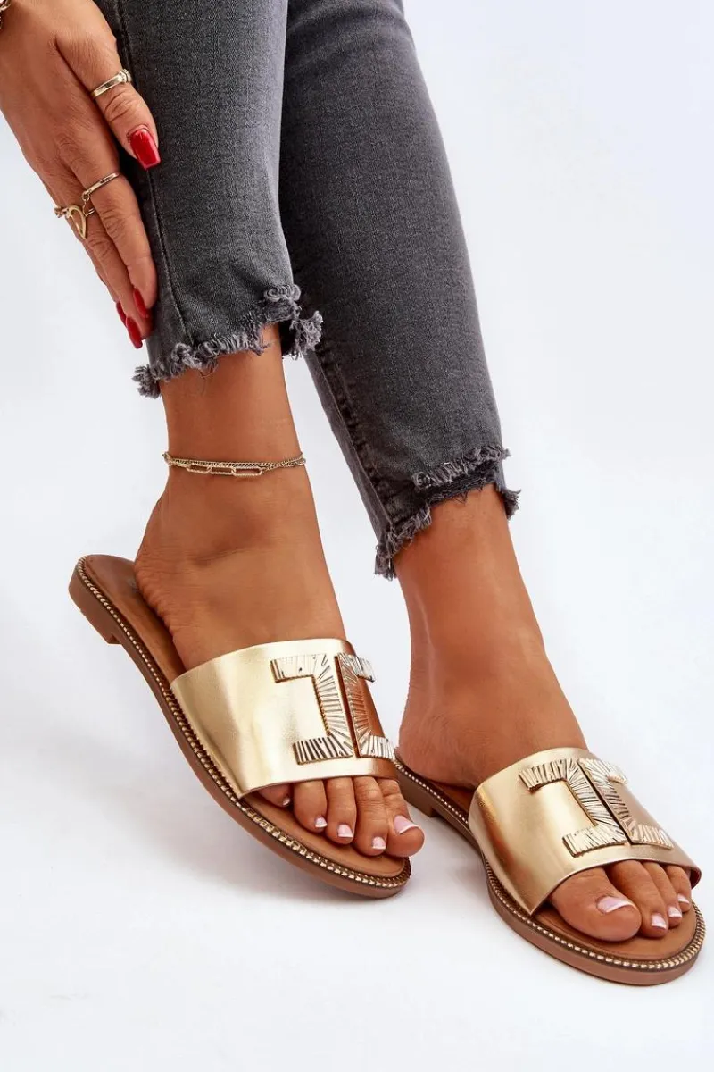 Klapki damskie na płaski obcasie, który gwarantuje stabilność i wygodę podczas noszenia. Na przodzie złota ozdoba, która dodaje im elegancji i subtelności. Model ten doskonale uzupełni letnie stylizacje! Przy wyborze rozmiaru prosimy sugerować się tabelą rozmiarów.