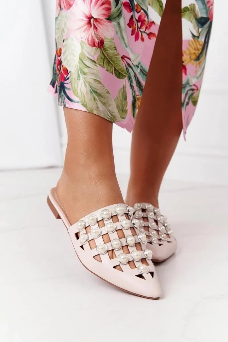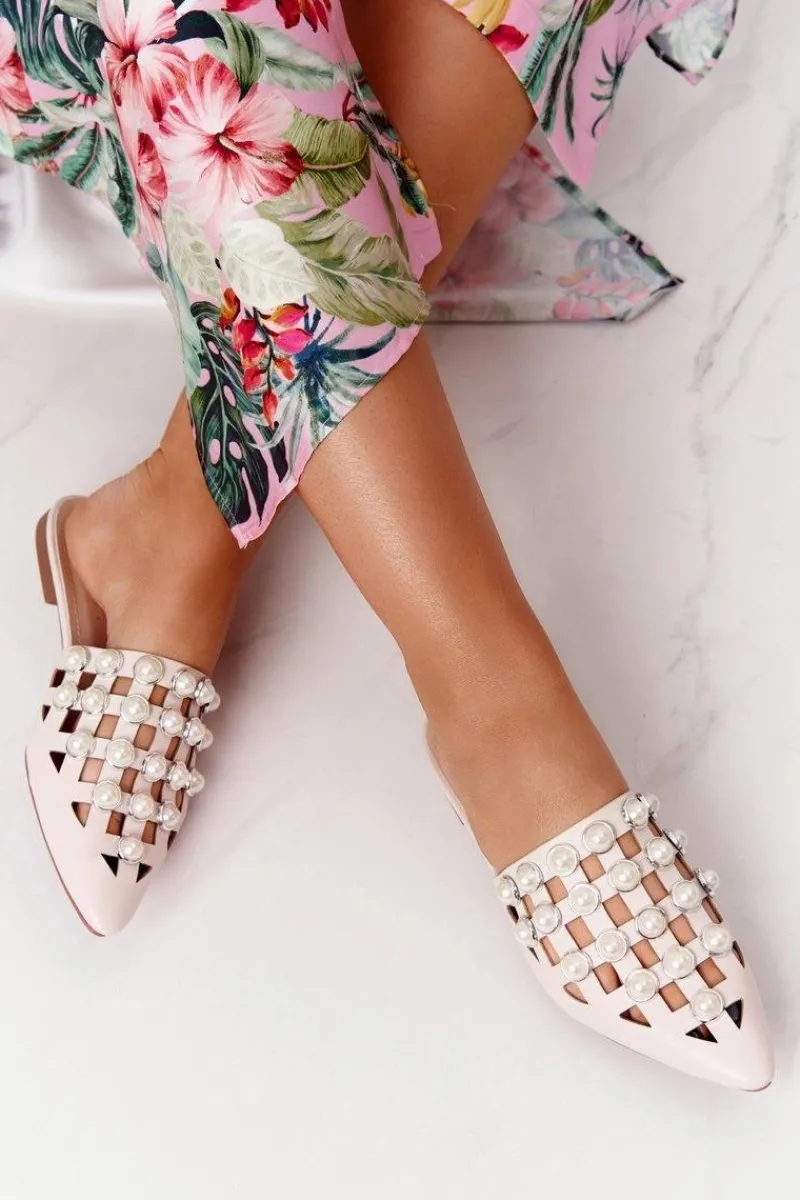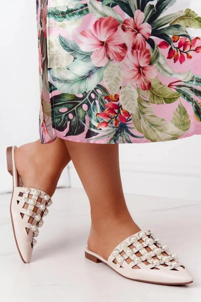 Eleganckie klapki damskie z cholewką ozdobioną perłami. Klapki posiadają miękką wkładkę z eko skóry oraz antypoślizgową podeszwę. Modny fason dopełni wiele letnich stylizacji! Koniecznie sprawdź całą naszą kolekcję klapek damskich. Przy wyborze rozmiaru prosimy sugerować się tabelą rozmiarów.