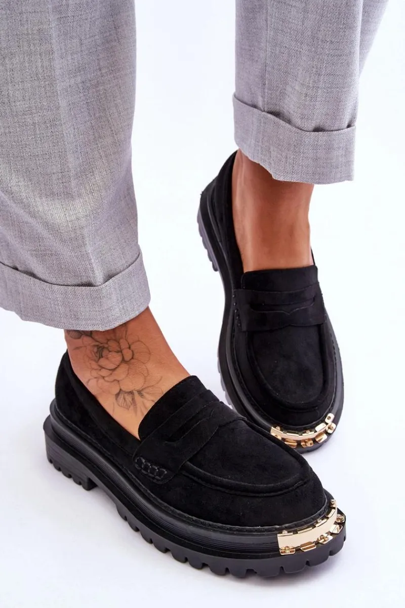 Klasyczne mokasyny zostały wykonane z ekologicznego zamszu. Na przodzie platformy posiadają ozdobne elementy. Osadzone na płaskim obcasie. Podeszwa z tworzywa sztucznego ze żłobieniami świetnie odizoluje od nierównego podłoża. Model wsuwany z usztywnianym zapiętkiem. Koniecznie powinnaś je mieć! Przy wyborze rozmiaru prosimy sugerować się tabelą rozmiarów.