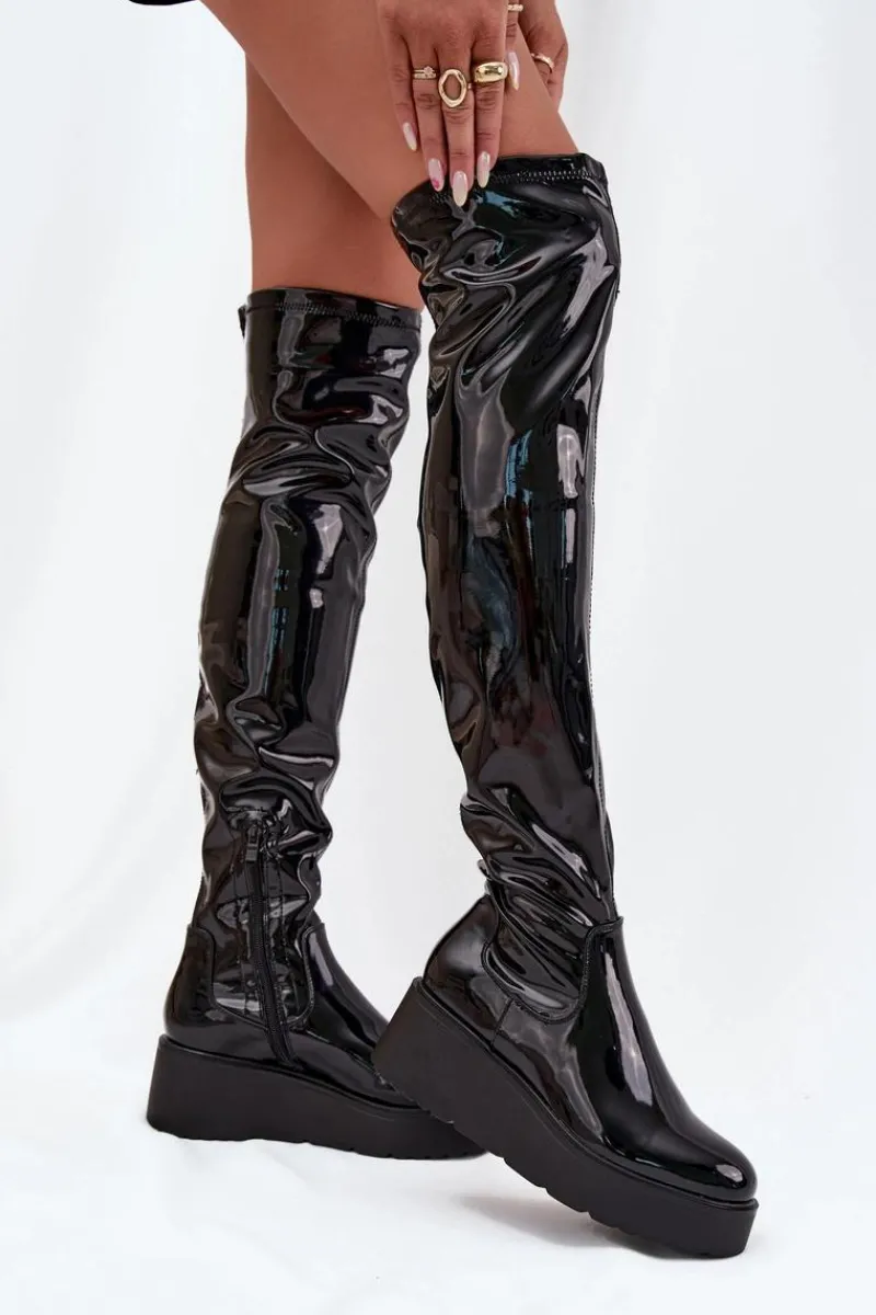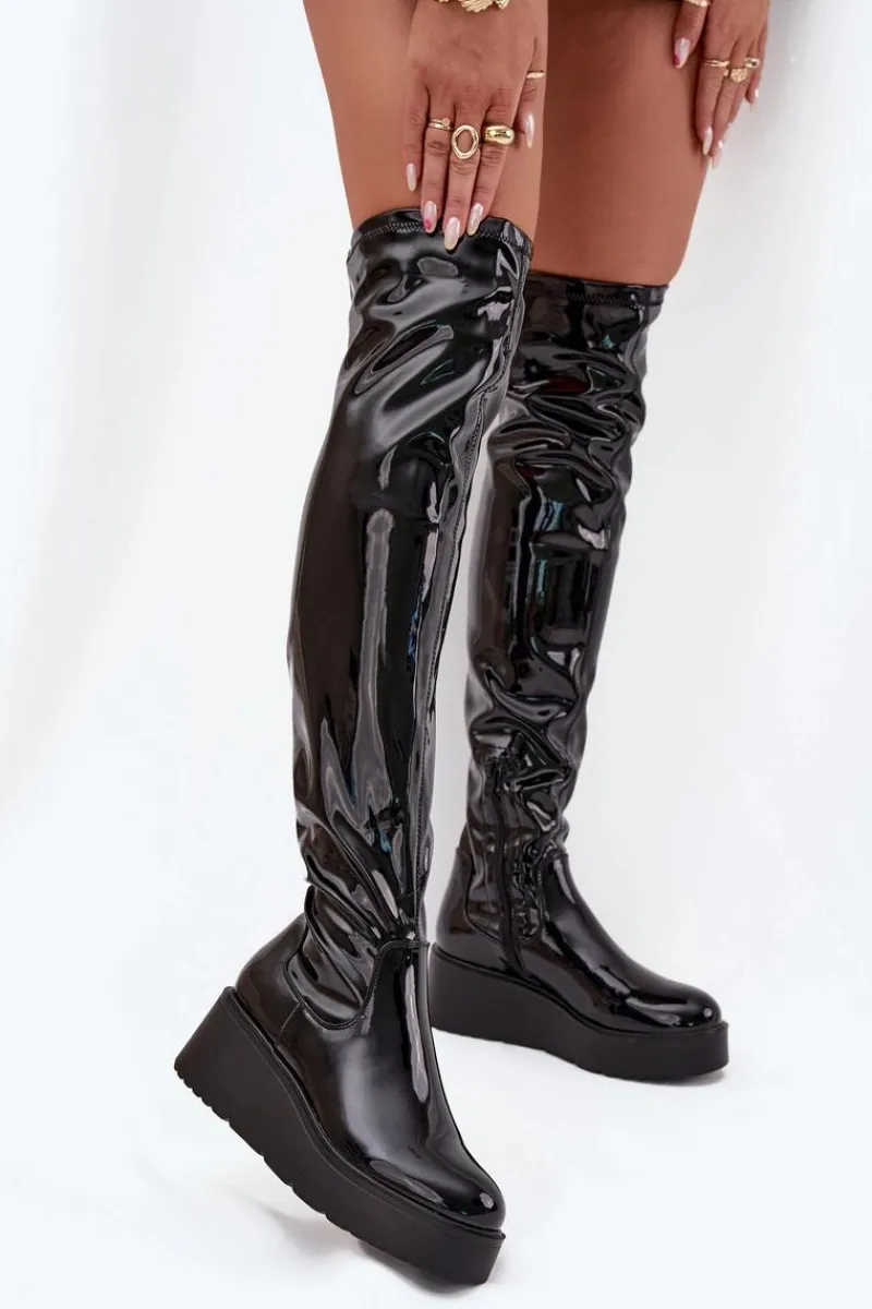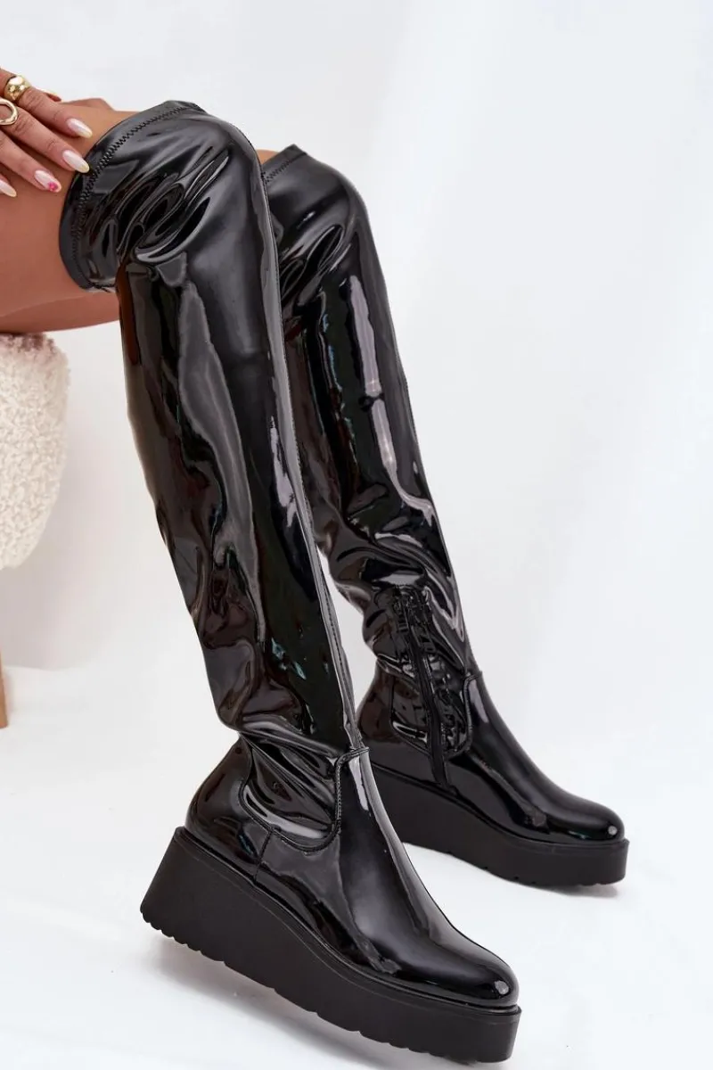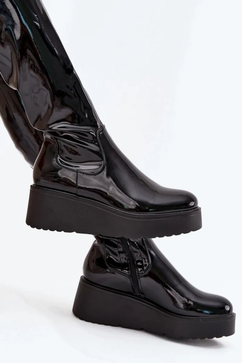 Kozaki damskie wykonane z lakierowanej eko skóry to elegancka propozycja na chłodniejsze dni. Osadzone na masywnej platformie i delikatnym koturnie, zapewniają stabilność i wygodę. Model wsuwany z dodatkowym suwakiem na dole cholewki ułatwia zakładanie i zdejmowanie butów. Zaokrąglone noski dodają im subtelnego charakteru, a ocieplenie kocem obuwniczym na poziomie stopy gwarantuje ciepło i komfort. Te kozaki to doskonałe uzupełnienie zimowych stylizacji, szczególnie w połączeniu z sukienkami i spódnicami. Przy wyborze rozmiaru prosimy sugerować się tabelą rozmiarów.