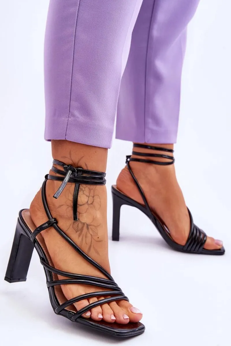 Eleganckie sandały damskie zostały wykonane z eko skóry. Model posiada wiązanie wokół łydki. Sandałki osadzono na płaskim obcasie w postaci słupka. Miękka wkładka z eko skóry zapewni komfortowe użytkowanie obuwia. Sandałki posiadają odkryty, kwadratowy nosek. Ten fason świetnie sprawdzi się do letnich sukienek czy eleganckich spodni. Przy wyborze rozmiaru prosimy sugerować się tabelą rozmiarów.