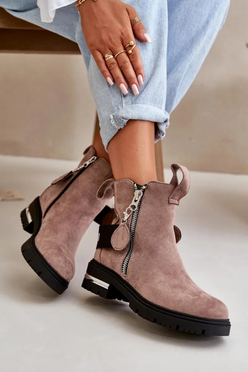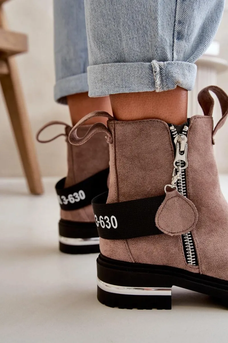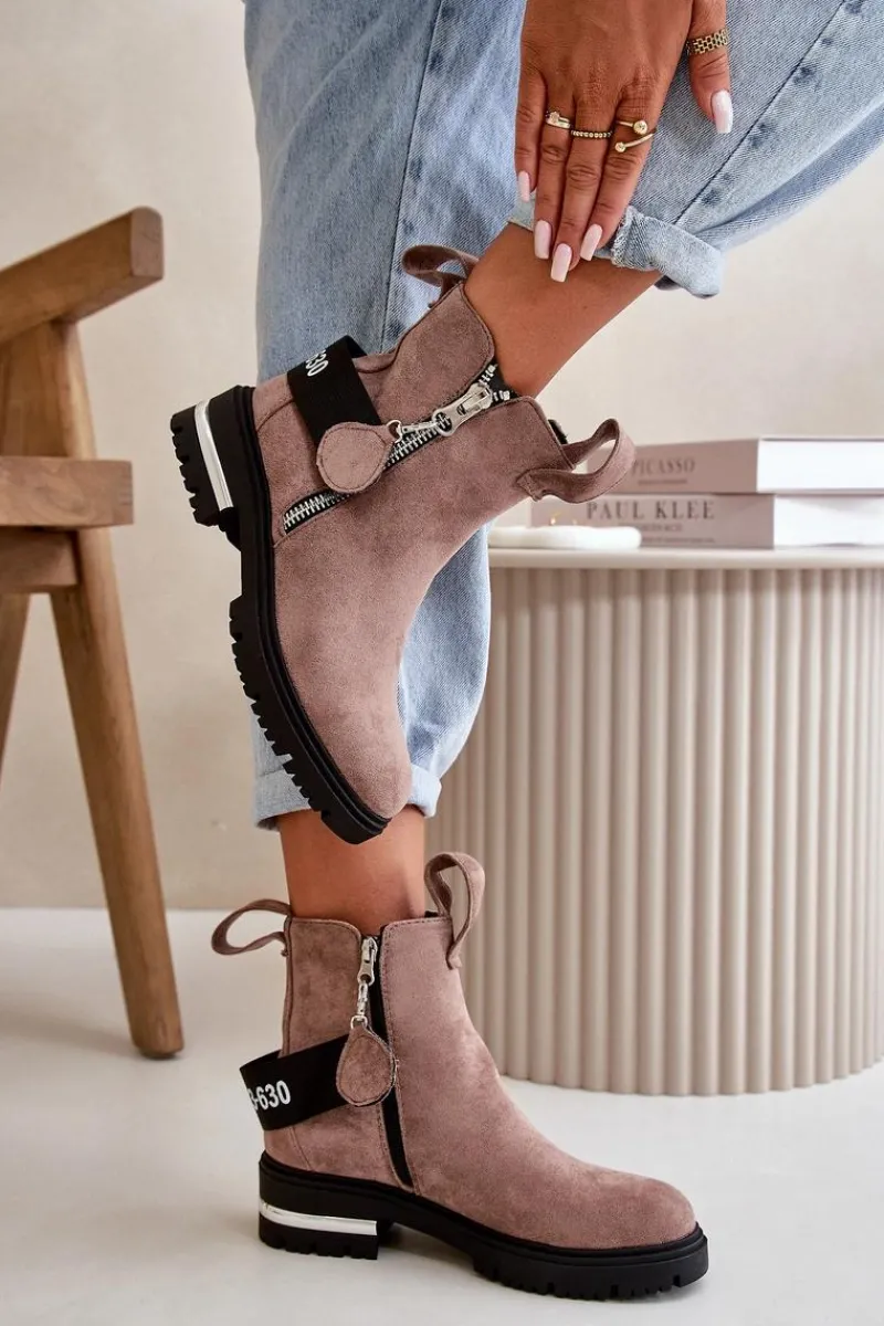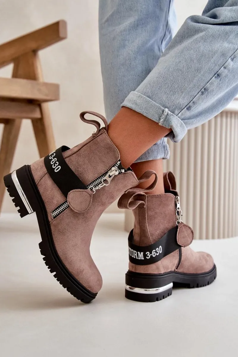 Botki damskie zostały wykonane z eko zamszu. Wnętrze ocieplone jest miłym w dotyku kocem obuwniczym. Dołączony do butów pasek jest odpinany. Botki posiadają dwa zamki, gdzie jeden z nich jest nieodpinany. Buty te osadzono na płaskim obcasie z lustrzaną wstawką i podeszwie z bieżnikiem. Świetny model do wielu jesiennych stylizacji! Przy wyborze rozmiaru prosimy sugerować się tabelą rozmiarów.