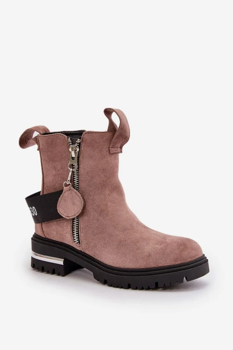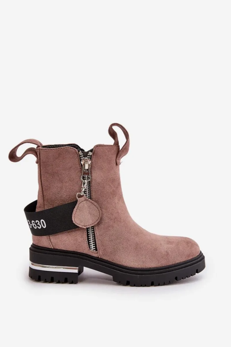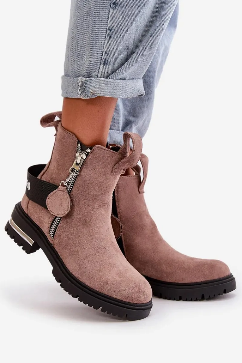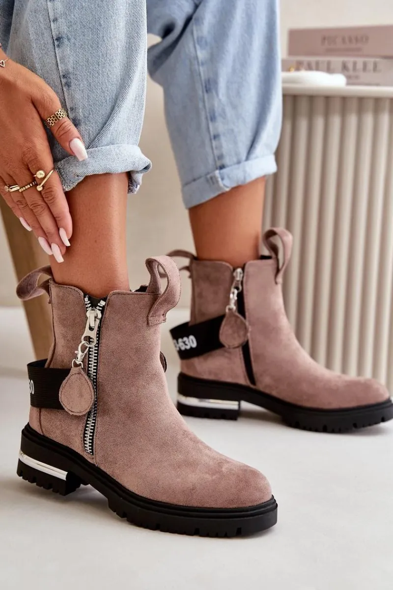 Botki damskie zostały wykonane z eko zamszu. Wnętrze ocieplone jest miłym w dotyku kocem obuwniczym. Dołączony do butów pasek jest odpinany. Botki posiadają dwa zamki, gdzie jeden z nich jest nieodpinany. Buty te osadzono na płaskim obcasie z lustrzaną wstawką i podeszwie z bieżnikiem. Świetny model do wielu jesiennych stylizacji! Przy wyborze rozmiaru prosimy sugerować się tabelą rozmiarów.