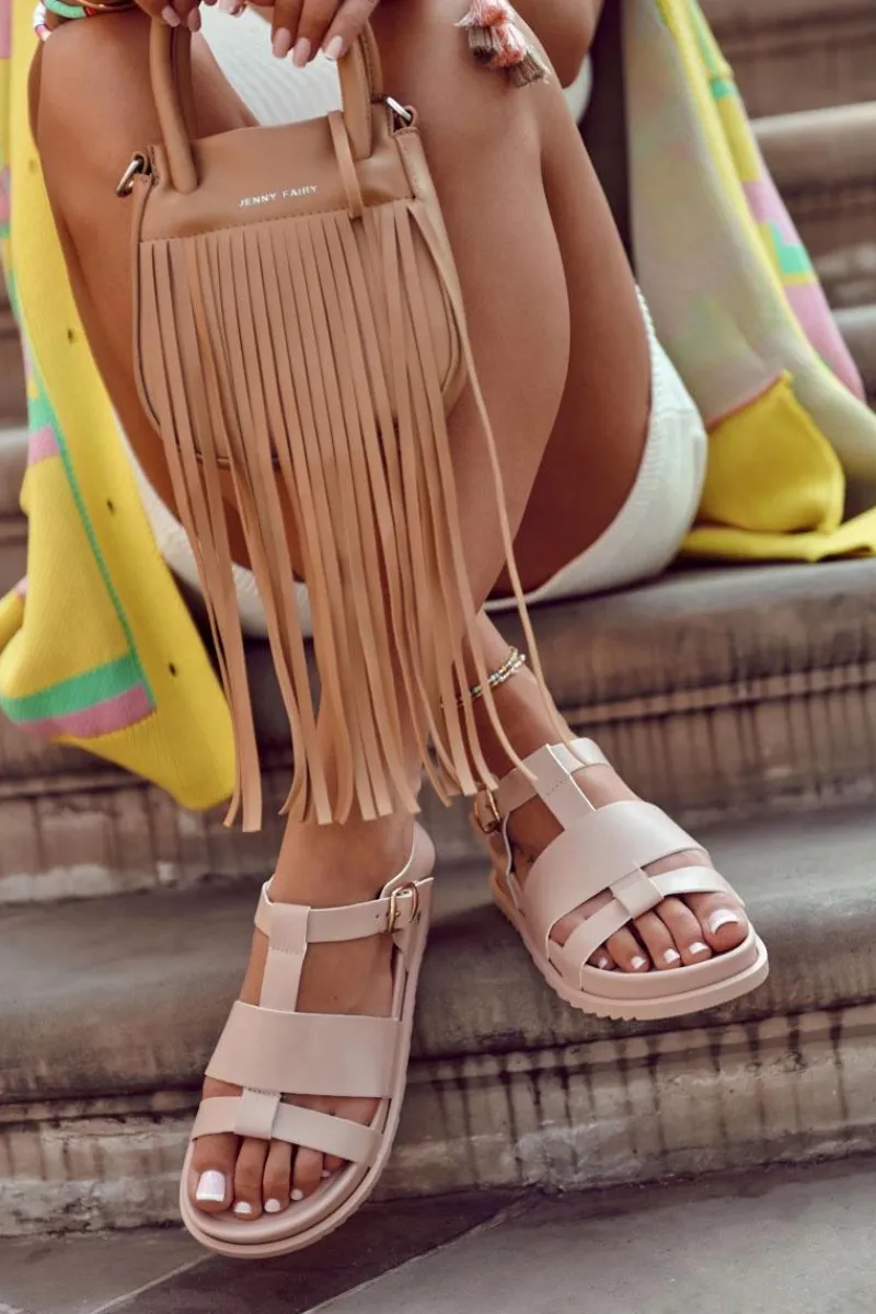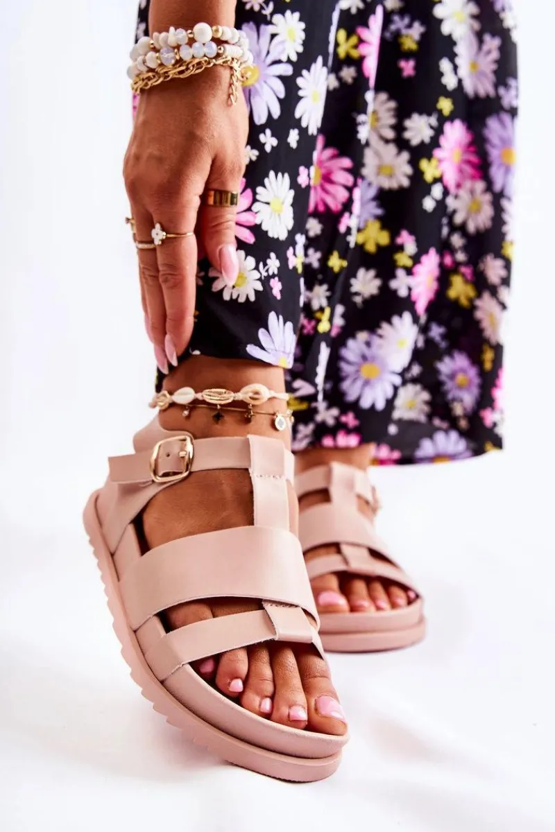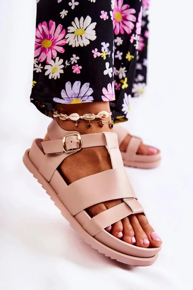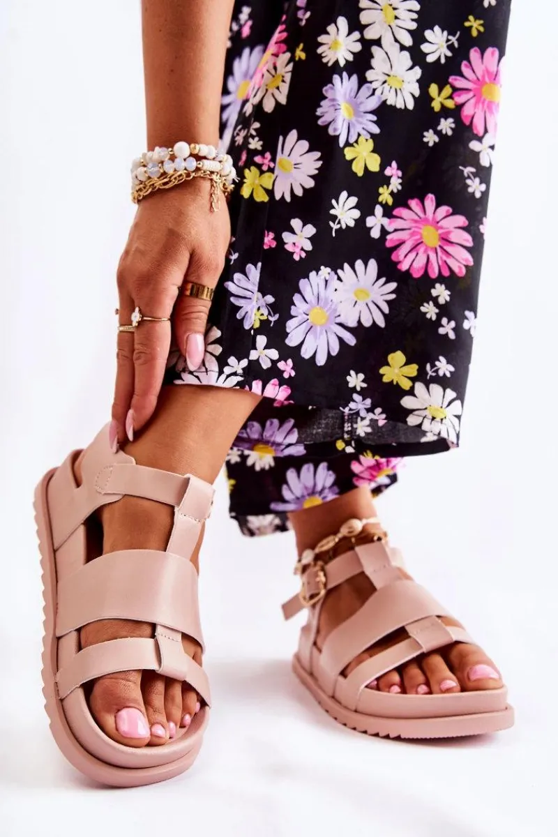 Modne oraz przewiewne sandały wykonane z eko skóry. Zapinane na regulowany pasek ze sprzączką. Sandałki posiadają odkryty, zaokrąglony nosek oraz odkrytą piętę. Miękka wkładka z tworzywa sztucznego zapewni wygodę podczas użytkowania. Dodatkowo wkładka jest profilowana. Platforma sprawia, że buty są niezwykle stabilne. Te sandałki to idealny fason na upalne dni. Świetnie będą prezentować się z zarówno ze spodniami, jak i sukienkami. Przy wyborze rozmiaru prosimy sugerować się tabelą rozmiarów.