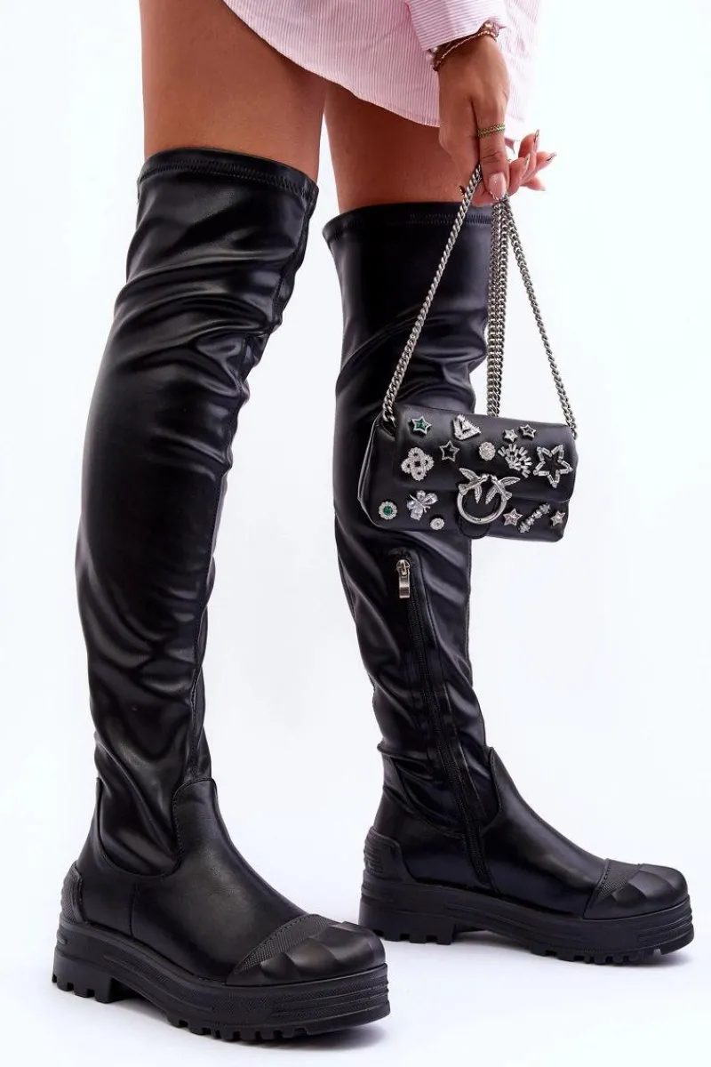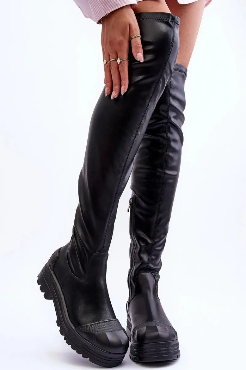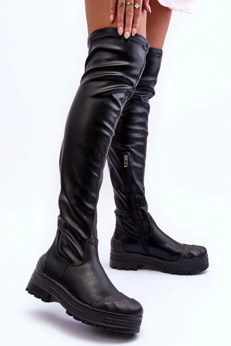 Wysokie kozaki za kolano wykonane z eko skóry. Posiadają ozdobny, gumowy nosek oraz zapiętki. Kozaki są zapinane na suwak u dołu cholewki. Masywna podeszwa zapewnia stabilność. W środku na wysokości stopy posiadają ocieplenie w postaci delikatnego koca obuwniczego. Koniecznie sprawdź także pozostałą naszą ofertę kozaków!
