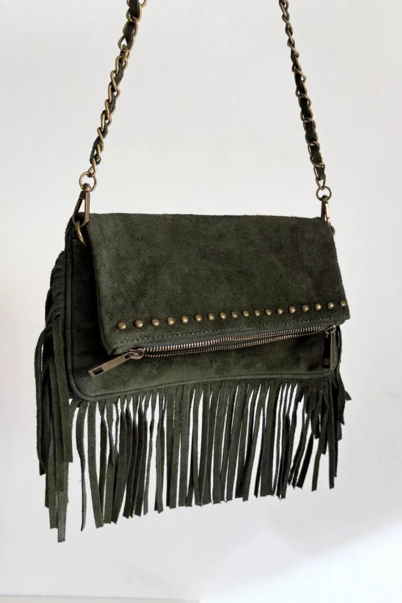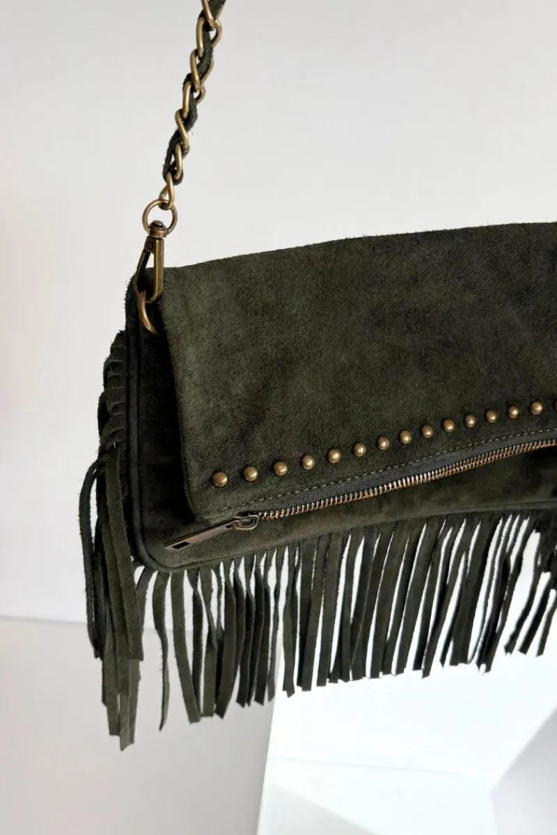 Mała torebka wykonana z naturalnego zamszu to stylowy dodatek, który doskonale uzupełni zarówno codzienne, jak i wieczorowe stylizacje. Zdobienie oraz frędzle nadają jej modnego, boho charakteru. Model posiada odpinany łańcuszek, dzięki czemu można ją nosić zarówno na ramieniu, jak i w dłoni. Torebka zapinana jest na dwa magnetyczne klipsy, co zapewnia wygodę i bezpieczeństwo użytkowania. To elegancka, a zarazem oryginalna propozycja dla kobiet, które cenią detale i niepowtarzalny styl.