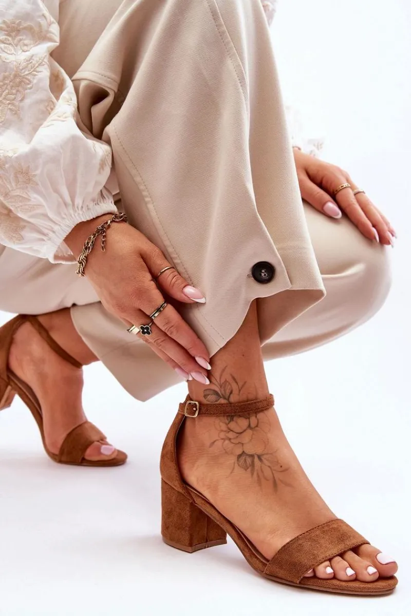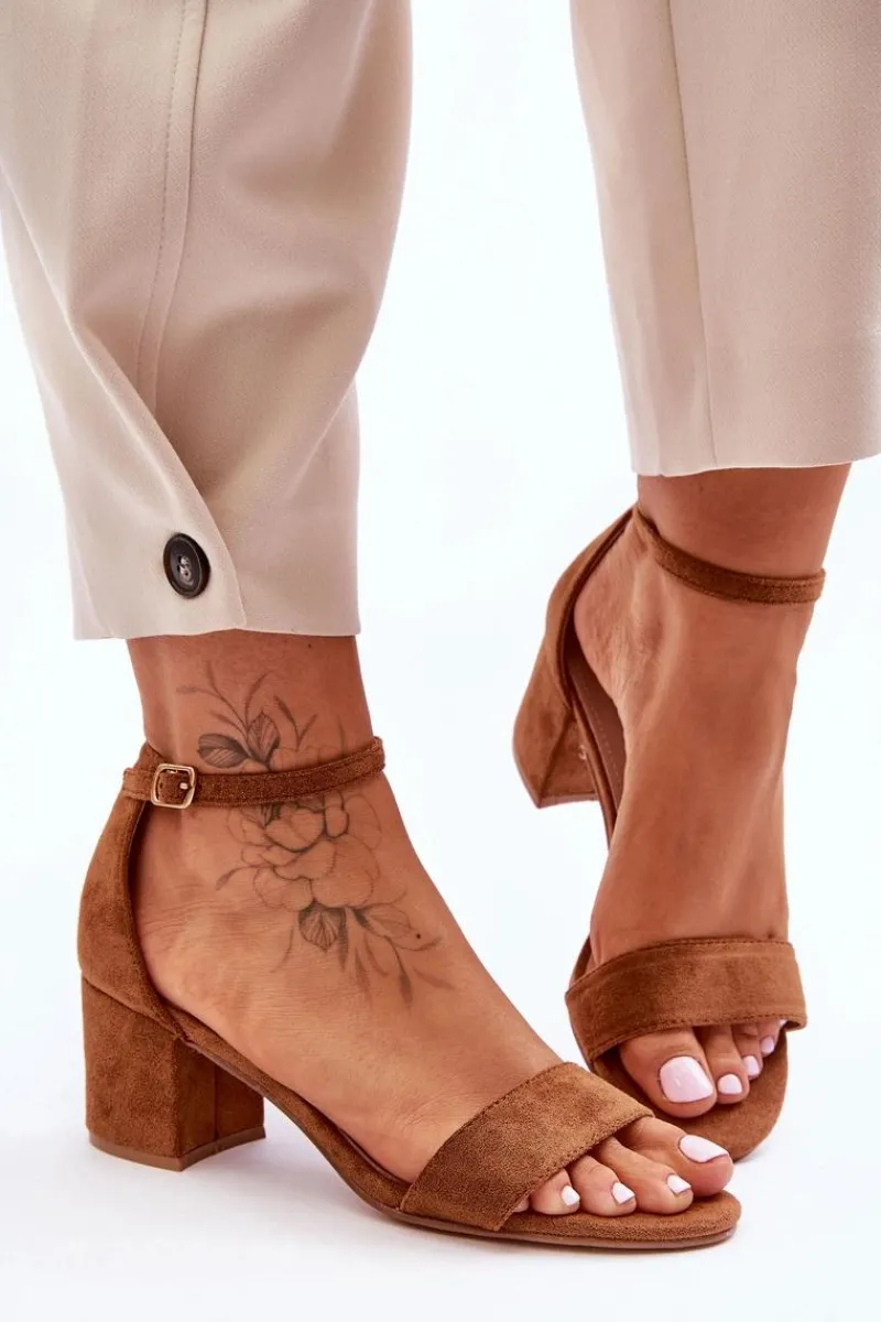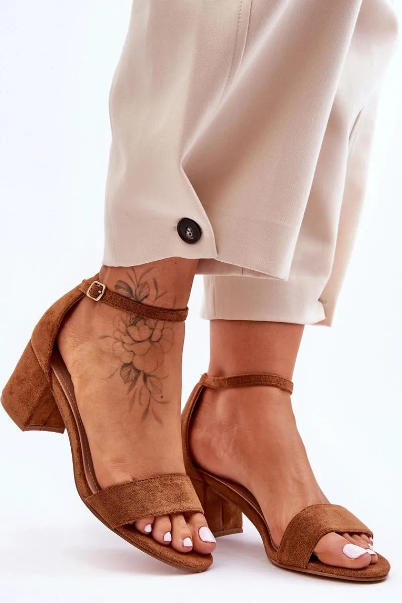Klasyczne sandałki na niewysokim obcasie w postaci stabilnego słupka zostały wykonane z przyjemnego w dotyku eko zamszu. Sandałki te posiadają usztywniany zapiętek. Wkładka została wykonana z eko skóry i zapewni komfort podczas użytkowania obuwia. Nosek odkryty, zaokrąglony. Zapinane wokół kostki na regulowany pasek ze sprzączką. Na pewno wykorzystasz je w wielu sytuacjach! Przy wyborze rozmiaru prosimy sugerować się tabelą rozmiarów.